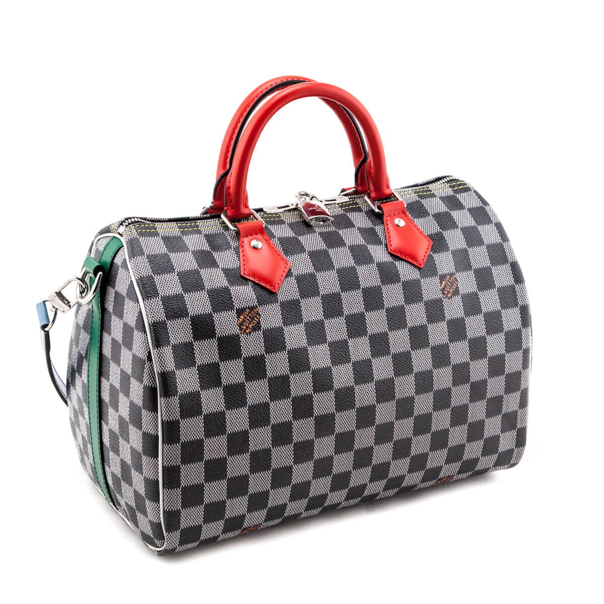 This Louis Vuitton Speedy Bandouliere 30 is a statement piece to amplify your luxury looks. Composed of a durable coated canvas in the black and white Damier checkerboard print, this preloved Louis Vuitton Speedy 30 contrasts its monochromatic frame with white leather piping, red leather top handles, kelly green leather trim, yellow contrast-stitching, a sky blue shoulder strap, and orange logos throughout. Bright silver-tone hardware provides a glossy finish to this iconic piece. Tote this pristine peloved LV satchel in hand by the dual rolled leather top handles, or attach the adjustable bandouliere strap to wear on-shoulder or crossbody with the provided strap extender. A two-way zipper and LV-engraved lock secure your essentials in the Damier Ebene microfiber-lined interior; featuring one slip pocket at the rear wall. This Louis Vuitton Black & White Damier Speedy Bandouliere 30 will be the highlight of your collection with its instantly recognizable print in a surprising colorway.