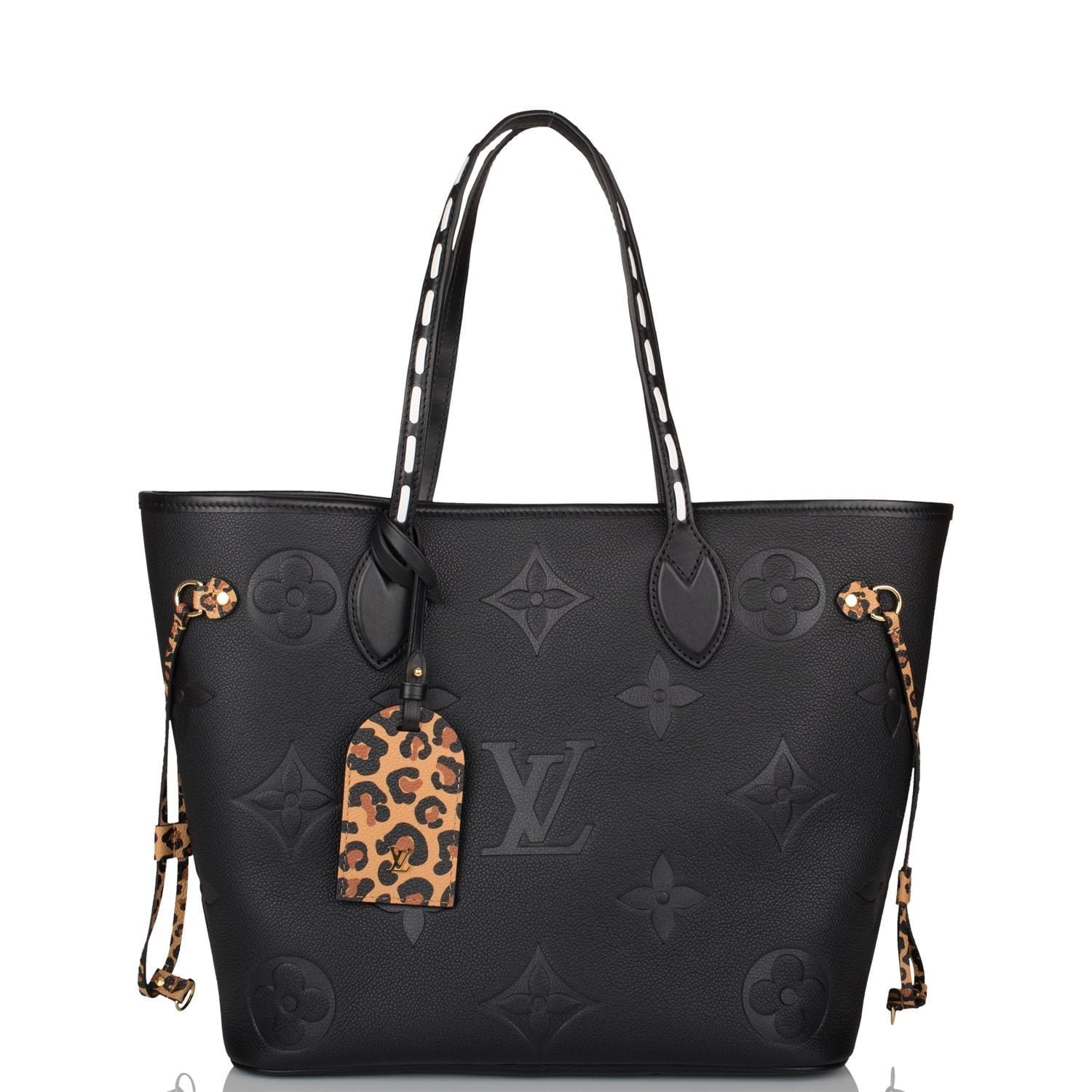 This limited edition ‘Wild At Heart’ Neverfull MM tote in black empreinte leather with golden tone hardware and features a removable leopard print pouch, black and white leather top strap handles, black trim and leopard side cinch cords with polished gold tone hardware and hidden top hook closure.