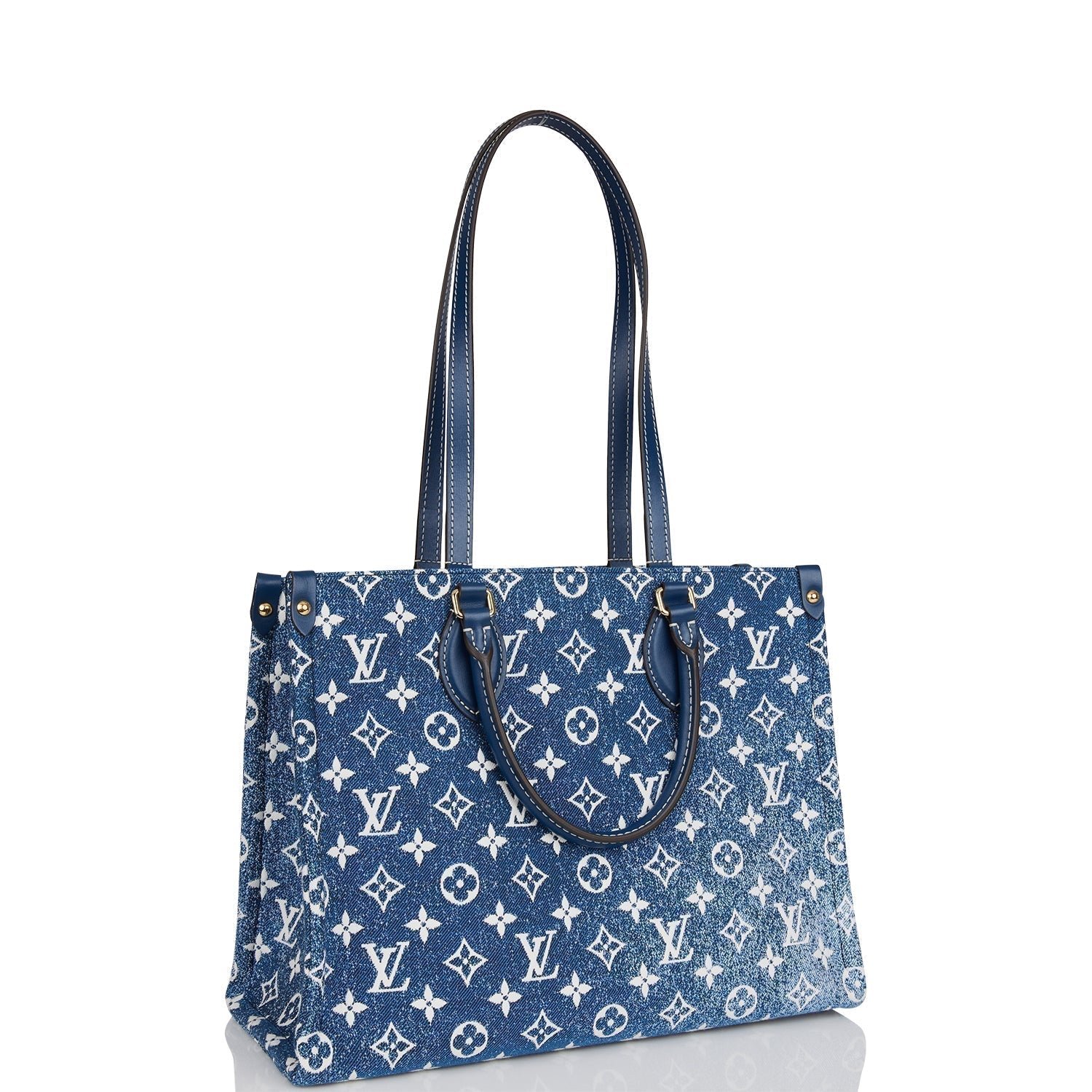 This OnTheGo tote is of blue denim with polished brass hardware and features blue leather top handles, trim and hidden interior shoulder straps with polished gold tone hardware and hidden top hook closure.