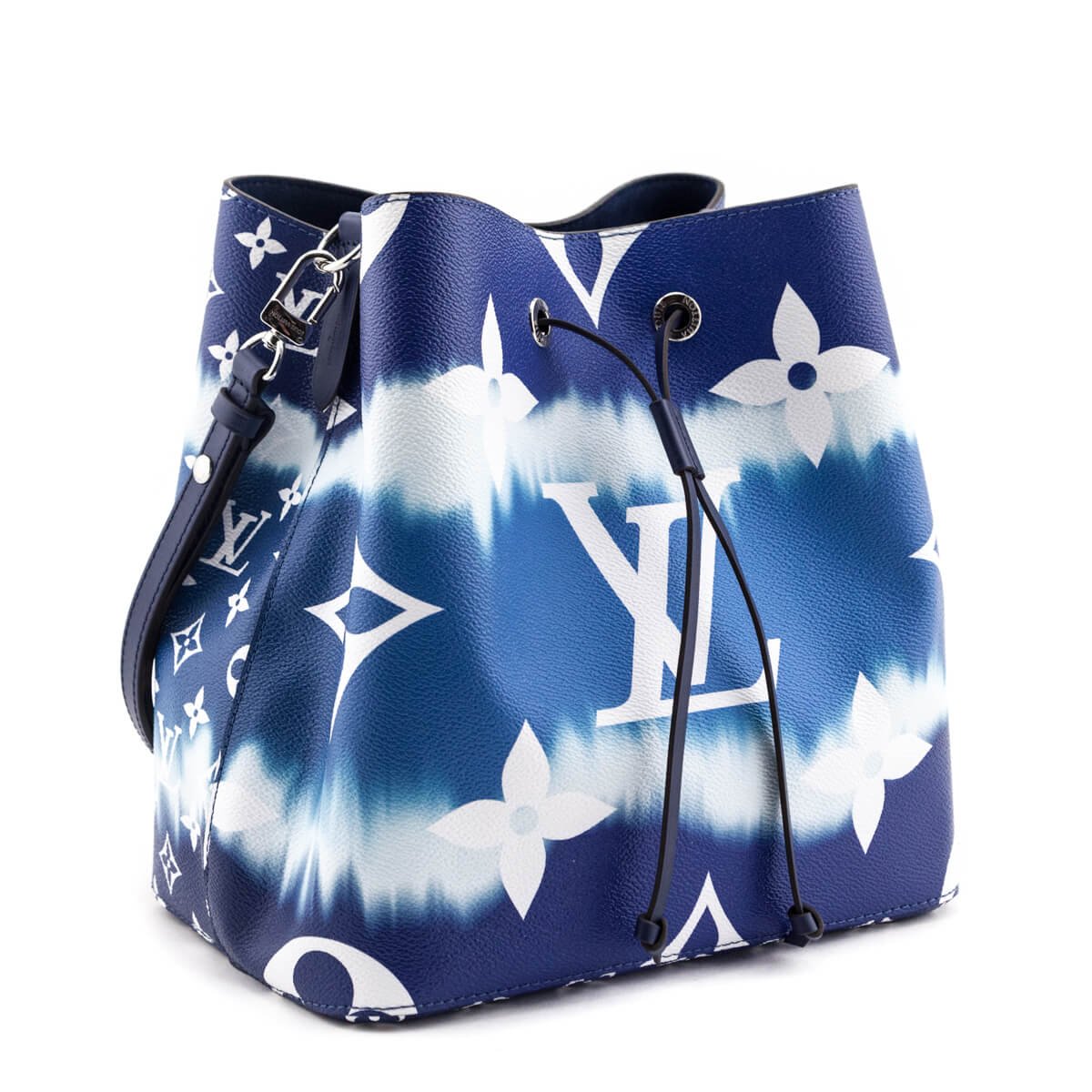 This Louis Vuitton NeoNoe reimagines the iconic Louis Vuitton Noe silhouette within a contemporary lens. The bucket bag frame is constructed of a gripping blue & white tie-dye effect coated canvas, with the giant LV monogram print in front in white, and the classic monogram print in white along the back and base. Silver-tone hardware adds some shine throughout, while navy leather trim elevates the design. Attach the adjustable navy leather strap to carry this preBlara Bagsd Louis Vuitton bag on-shoulder or crossbody. A drawstring closure secures this pristine preBlara Bagsd Louis Vuitton bag closed. Separated into two open compartments by a zippered partition wall, the navy microfiber-lined interior offers a spacious home for your essentials. This Louis Vuitton Blue Giant Monogram Escale Neonoe MM is the everyday bag for the not-so-everyday individual.