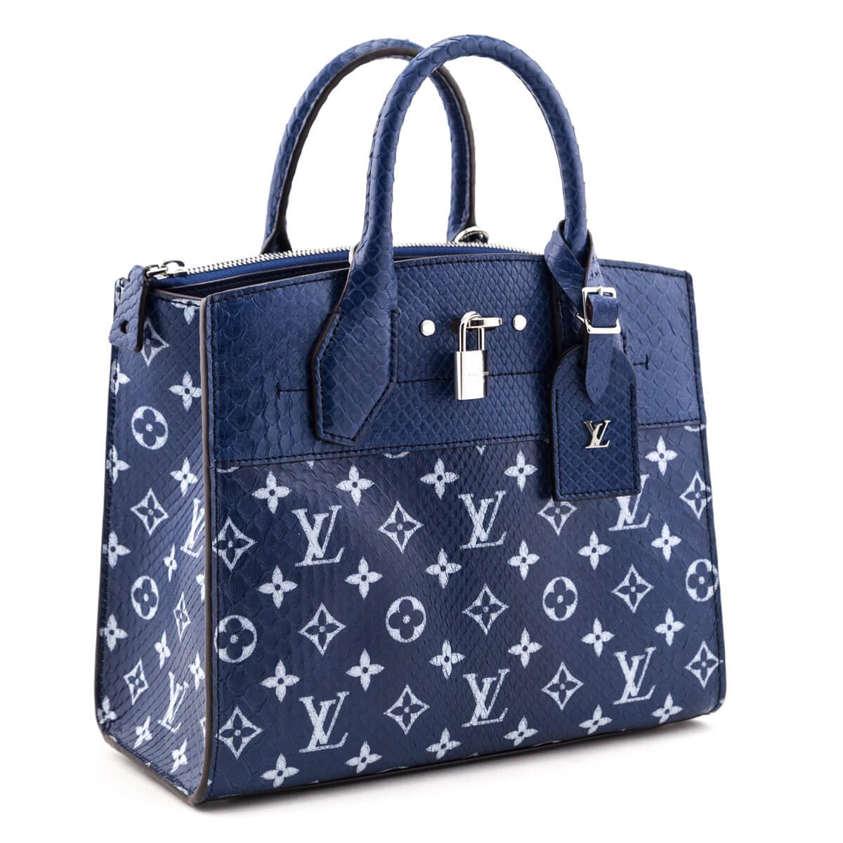 This Louis Vuitton City Steamer MM is an exquisite exotic chic pick for on-the-go style. The navy and light blue monogram printed python body is afforded glossy contrast in the metallic silver-tone hardware. The subtly curved lines of this dramatically structured piece widen at the base, ensuring a flat bottom for the protective metal feet. At the front, a detachable luggage tag offers a subtle nod to the French label’s early origins in designer luggage. Tote this refined Louis Vuitton bag in hand by the rolled python top handles, or attach the matching crossbody strap to display the striking silhouette of this designer bag. A large slip pocket spans the interior wall, anchoring in a twist-lock closure to display the signature engraved LV lock at the exterior front. At the reverse, a large zippered pocket spans the rear wall of the interior. Located between the front and back wall pockets is the main interior, lined in a blue lambskin & goatskin, and featuring an open slip pocket and a clip-top closure at its entrance. The luxury brand’s attention to detail is evident in this finely crafted Louis Vuitton handbag.