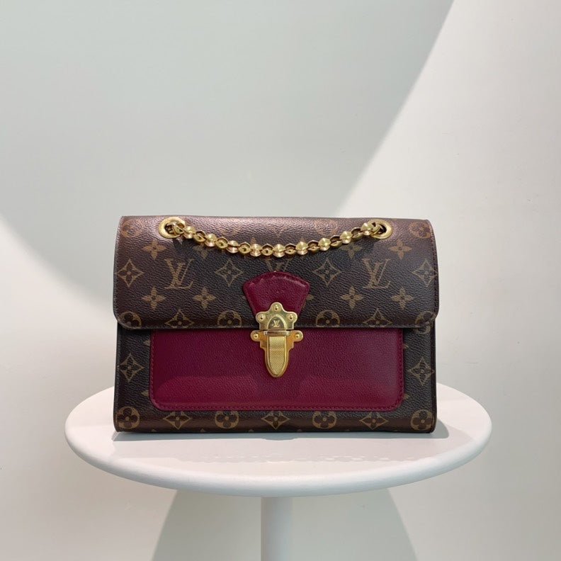 This is an authentic LOUIS VUITTON Monogram Canvas Shoulder Bag. This elegant shoulder bag is crafted of Louis Vuitton monogram canvas with a sophisticated gold chain strap. The bag features a burgundy leather accent and a secure gold-tone clasp. The interior opens to a spacious compartment perfect for daily essentials, combining luxury and practicality effortlessly.