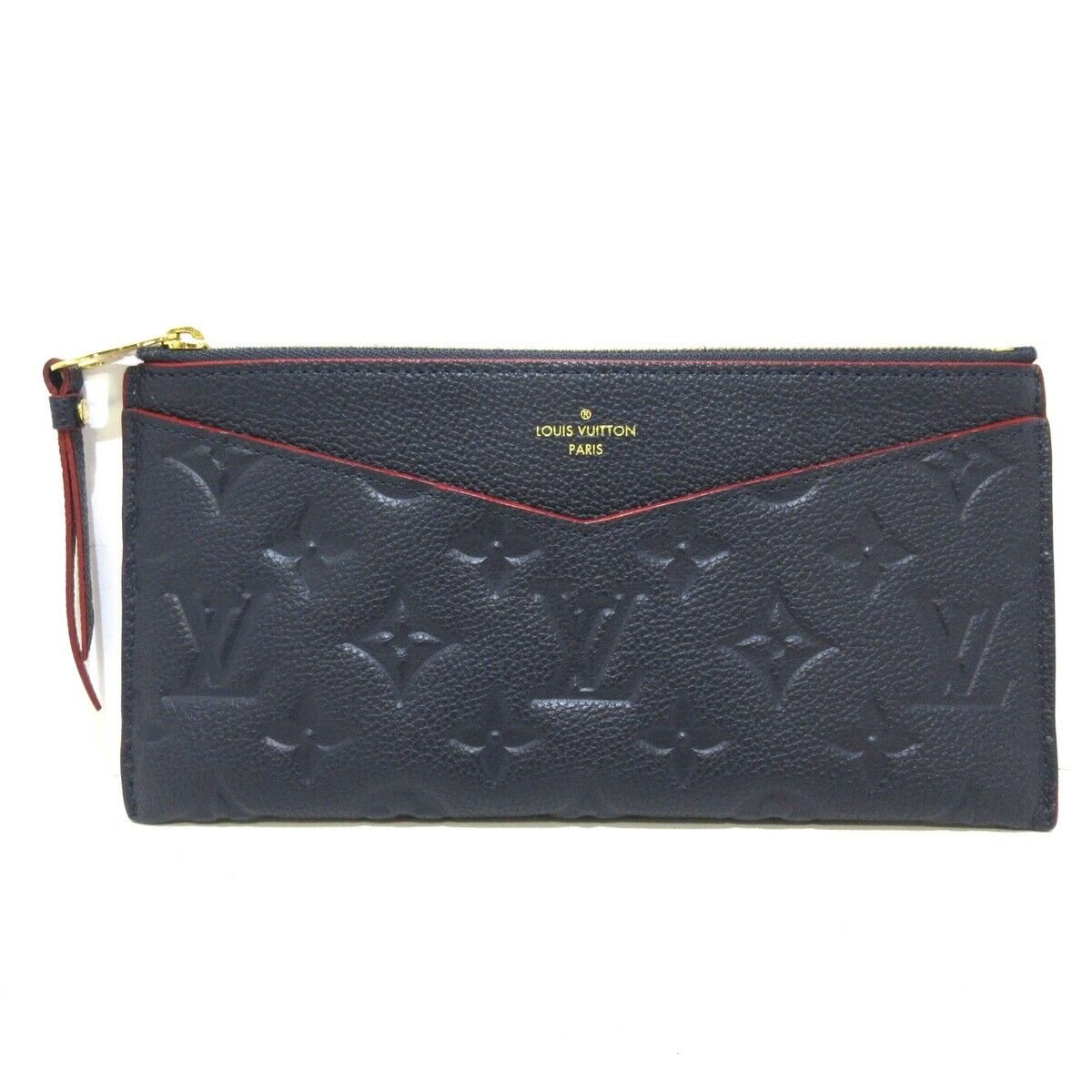 Diese Louis Vuitton Clutch wurde aus blauem Empreinte Monogram Leder gefertigt und wird von roten Details umspielt. Im Innenraum beherbergt die Tasche Steckfächer für Karten. An der oberen Öffnung wird die Tasche über einen Reissverschluss geschlossen. Perfekt zu maritimen Outfits und Jeans.