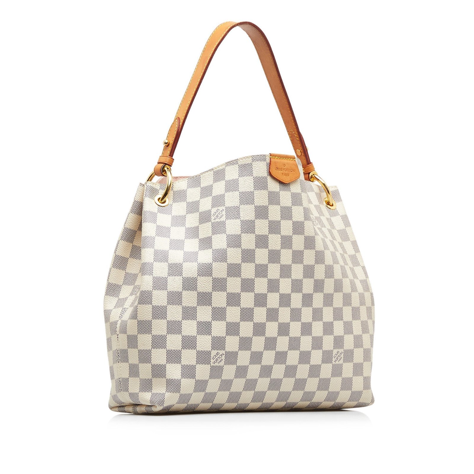 The Graceful PM features a damier canvas body, a flat vachetta leather strap, a top magnetic closure, and an interior zip pocket.