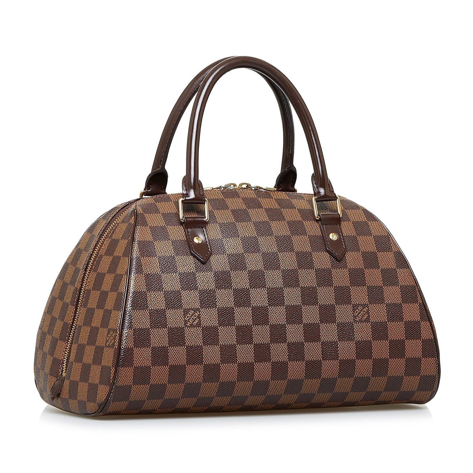 The Ribera MM features a damier ebene canvas body, rolled leather handles, top zip closure, and an interior slip pocket.