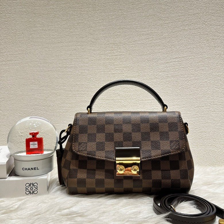 This authentic used Louis Vuitton Damier Ebene Trevi PM Satchel is a timeless classic for those who admire elegance in used designer handbags. Its distinctive checkered canvas and structured silhouette bring sophistication to any ensemble. The black leather top handle and detachable strap offer versatile carry options, while the vibrant red fabric lining with patch pockets ensures practical storage. Perfect for enthusiasts of vintage Louis Vuitton bags, this piece is a coveted addition to any collection.