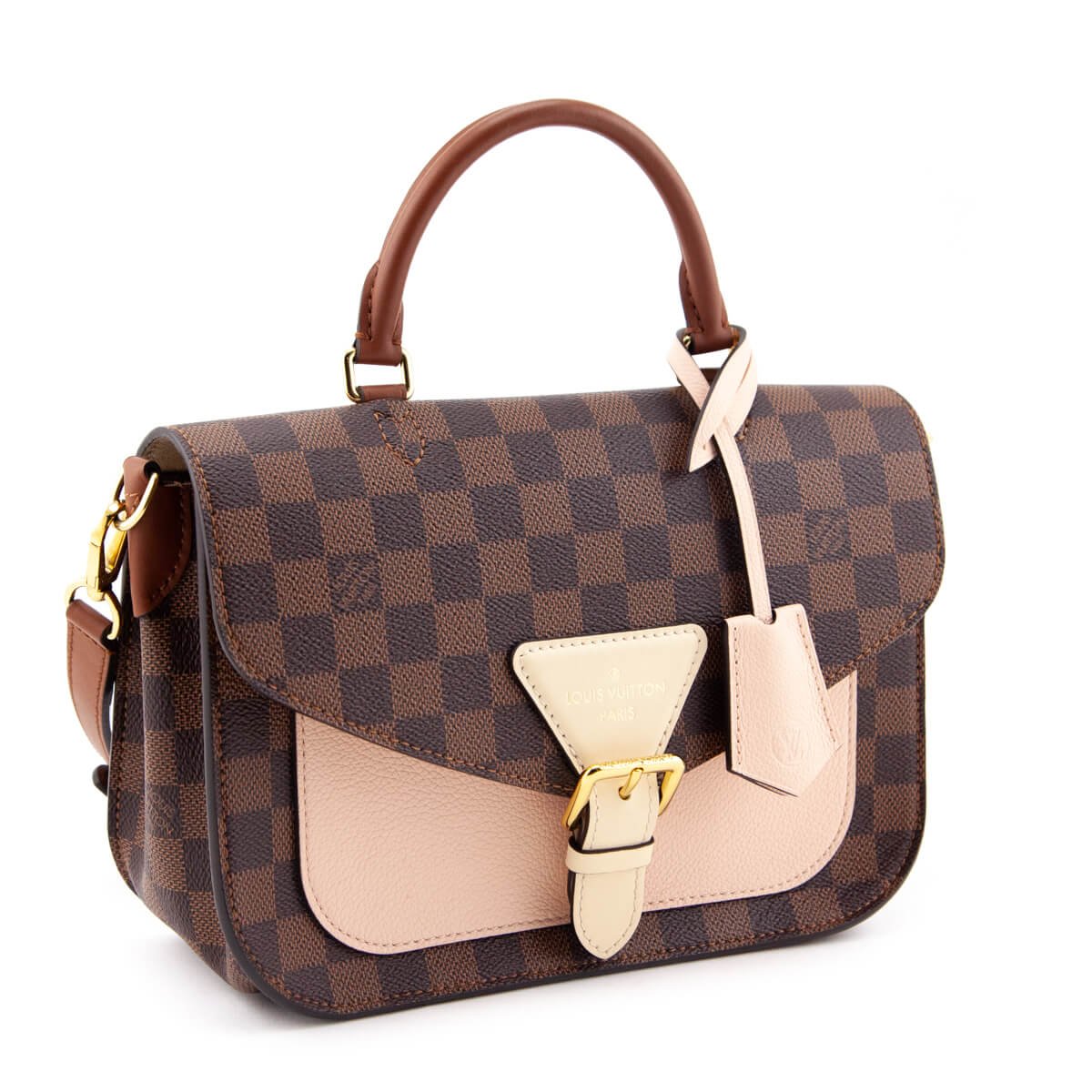 This Louis Vuitton Beaumarchais Bag is a coveted handbag for its elegance and practicality. The exterior is in the signature two-tone brown checkerboard printed coated canvas with medium tone brown cowhide trim and gold-tone hardware. A sleek matching slip patch pocket presents in back for quick storage. The front of the bag stands out with its ivory and pale pink grained leather accents, decorative buckle concealing a magnetic closure, and hanging removable clochette concealing a keyring. This versatile pick can be carried in hand via one rolled leather top handle, or worn on shoulder or crossbody with the flat leather adjustable/removable strap. Peaking out from under the top flap is a slip pocket for extra organization in a pale pink grained leather. Once inside the beige microfiber lined interior, two open compartments can be found, separated by a center dividing slip pocket wall. A classic LV concept, reworked and reimagined, the Louis Vuitton Damier Ebene Venus Pink Beaumarchais Bag is both instantly recognizable and still completely unique.