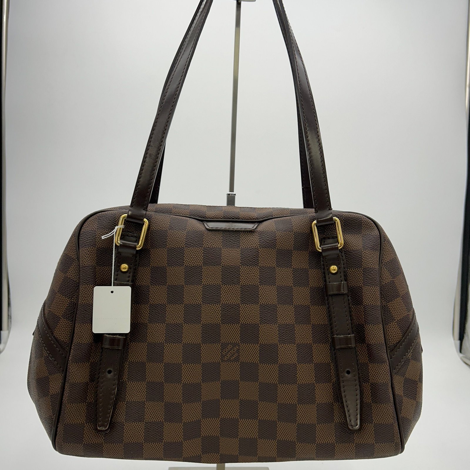 Authentic Louis Vuitton Damier Rivington GM Shoulder Bag in classic Ebene color. This pre-owned luxury bag features the signature Damier Canvas exterior with a spacious red canvas interior, perfect for the stylish woman on the go. |