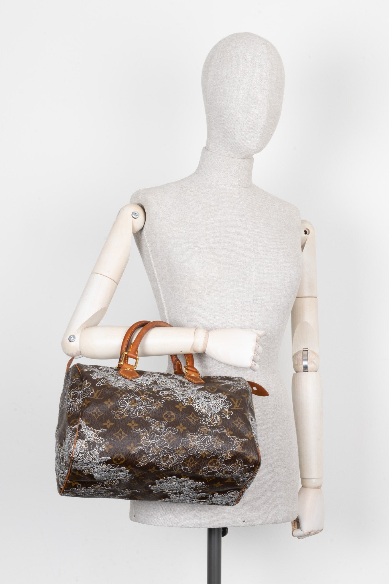 Die klassische Speedy 30 zeigt sich hier mit einer wunderschönen weissen Stickerei im filigranen Blumenmuster. Einzigartig, detailverliebt und eine Hommage an traditionelles Handwerk – ein echtes Sammlerstück für Louis Vuitton Liebhaber.