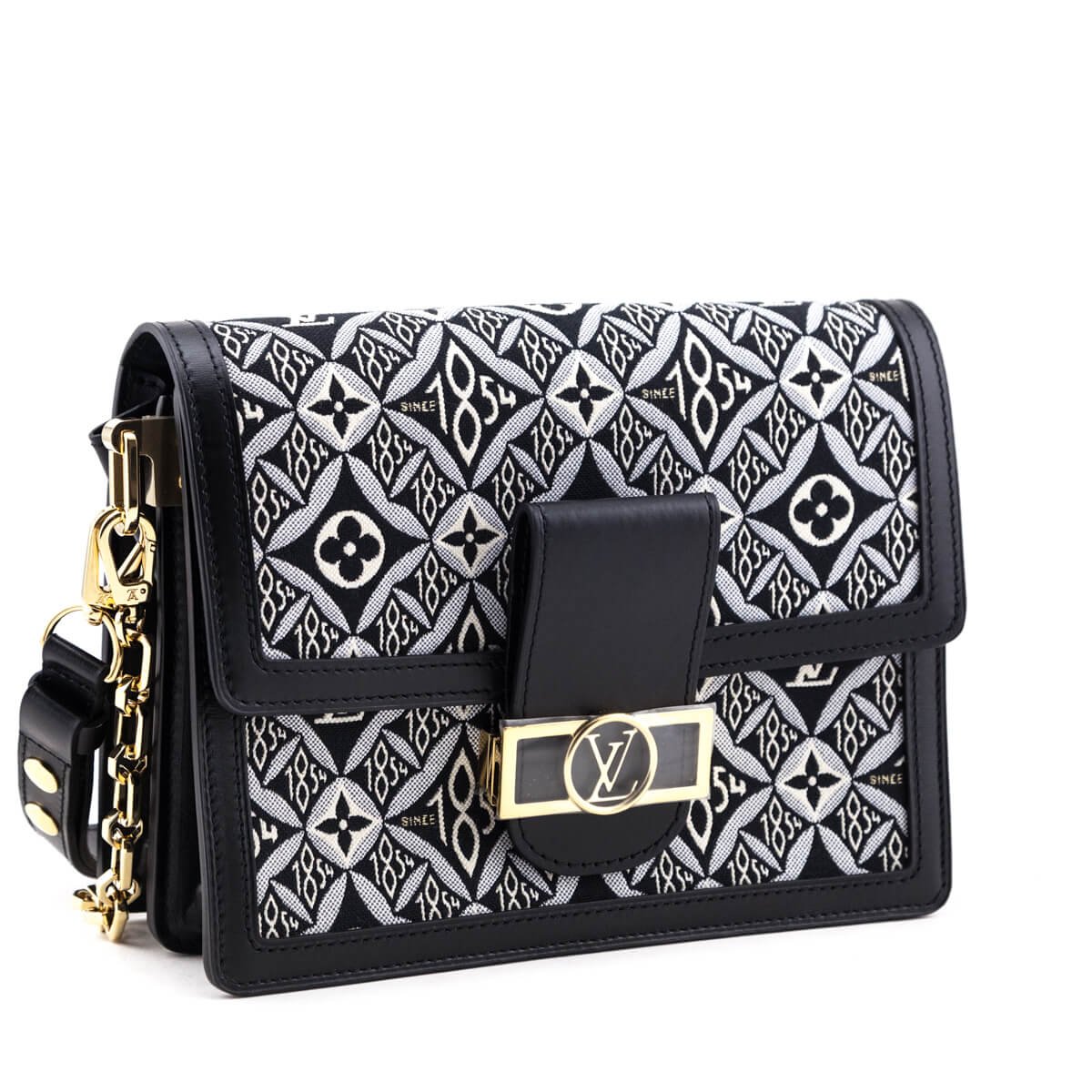 A totally unique design from the french fashion house, this authentic pristine preloved Louis Vuitton Since 1854 Dauphine MM is an absolute collectable! Crafted from Louis Vuitton’s specialty jacquard canvas in shades of black, grey, and white, this statement woven print features a blend of the brand’s famous florals and the year 1854 represented throughout. Black leather accents frame the bag, and make up the front tab closure, with a gold-tone LV emblem at its base concealing a magnetic snap closure. Both removable, this preowned Louis Vuitton bag comes with an adjustable black leather shoulder/crossbody strap, and a gold-tone chain shoulder strap. Inside, this luxury designer bag is lined with a black microfiber textile, offering two main compartments with a center-dividing zipper pocket for organized storage, and a small slip pocket along the inner back wall. Turn heads everywhere you go with this Louis Vuitton Grey Jacquard Since 1854 Dauphine MM!
