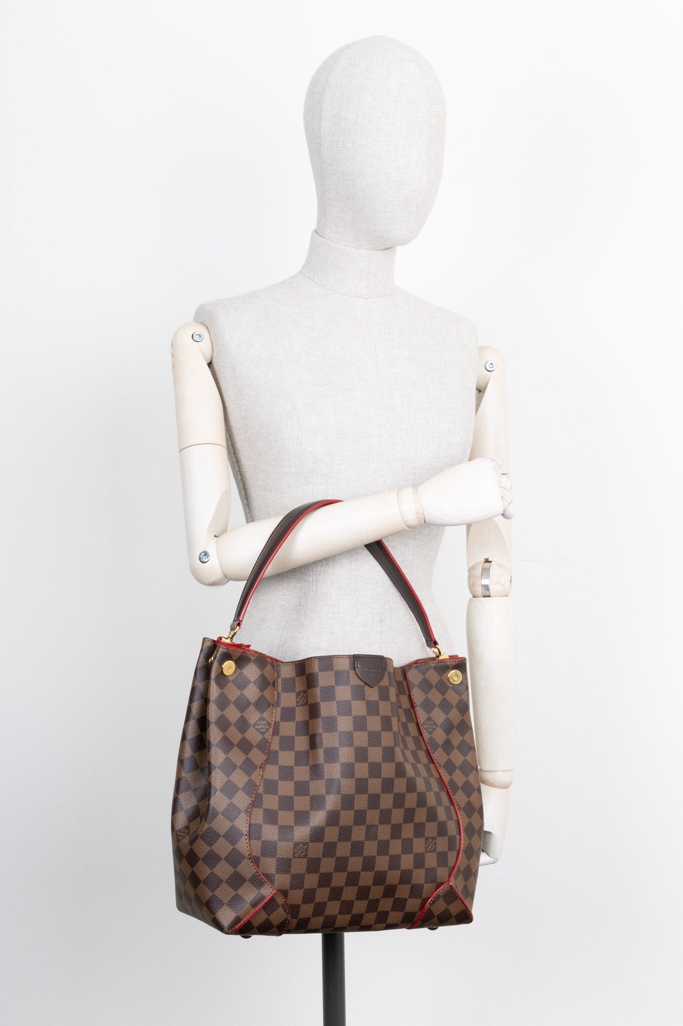 We Love: Die Caissa Bag ist eine stilvolle und elegante Handtasche, die zur Damier Ebene-Kollektion von Louis Vuitton gehört. Die Damier Ebene ist ein ikonisches Monogramm-Muster des Hauses Louis Vuitton, das aus dunkelbraunem Canvas mit dem charakteristischen LV-Logo in einem Rautenmuster und braunen Lederakzenten besteht.