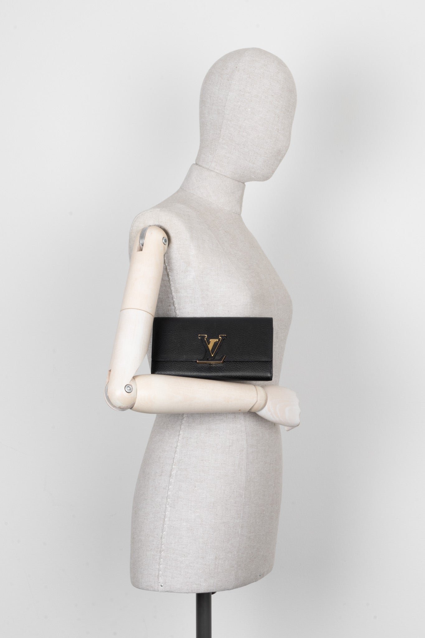 Dieses Louis Vuitton Capucines Wallet aus schwarzem Taurillon-Leder ist ein elegantes und funktionales Accessoire. Inspiriert von der emblematischen Capucines Linie, besticht die Geldbörse durch ihre raffinierte Verarbeitung und die dezente LV-Signatur, die in Leder gehüllt ist. Das Material, Taurillon-Leder, ist bekannt für seine Geschmeidigkeit und Langlebigkeit. Mit ausreichend Platz für all die wichtigen Dinge ist dieses Accessoire sowohl praktisch als auch stilvoll.