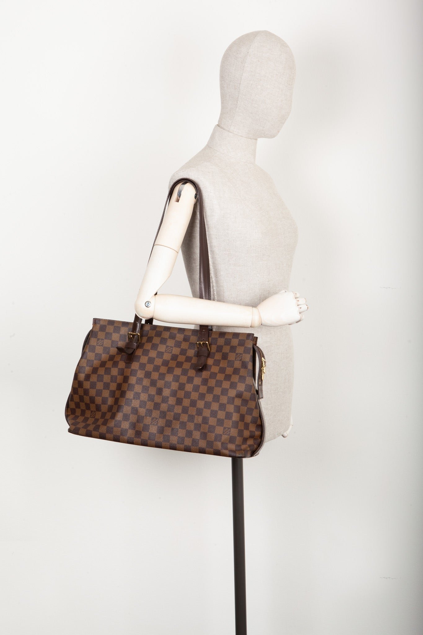 We Love: Die Louis Vuitton Chelsea Bag ist eine stilvolle und elegante Handtasche, die zur Damier Ebene-Kollektion von Louis Vuitton gehört. Die Damier Ebene ist ein ikonisches Monogramm-Muster des Hauses Louis Vuitton, das aus dunkelbraunem Canvas mit dem charakteristischen LV-Logo in einem Rautenmuster und braunen Lederakzenten besteht.