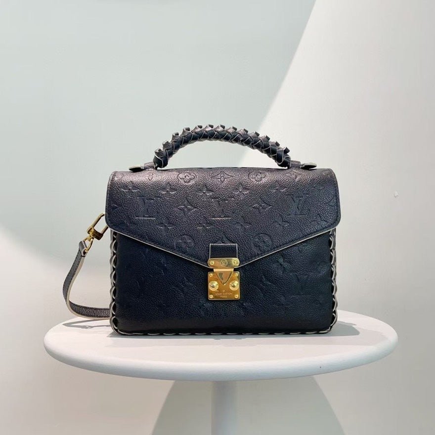 This is an authentic LOUIS VUITTON Métis Satchel/Top Handle Bag. This elegant bag is crafted from premium black monogram leather. It features a chic braided leather top handle, a detachable shoulder strap, and stunning gold-tone hardware. The top flap, secured with a distinctive S-lock, opens to a spacious interior, perfect for organizing essentials. This versatile and sophisticated handbag is ideal for day-to-night wear, showcasing the timeless style of Louis Vuitton.