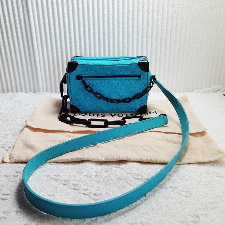 Experience luxury and style with this preloved Louis Vuitton Mini Soft Trunk bag. Crafted from turquoise leather, it features the iconic monogram pattern, a sleek crossbody strap, and black hardware accents. This vintage Louis Vuitton bag stands out among used designer handbags, perfect for any collection.