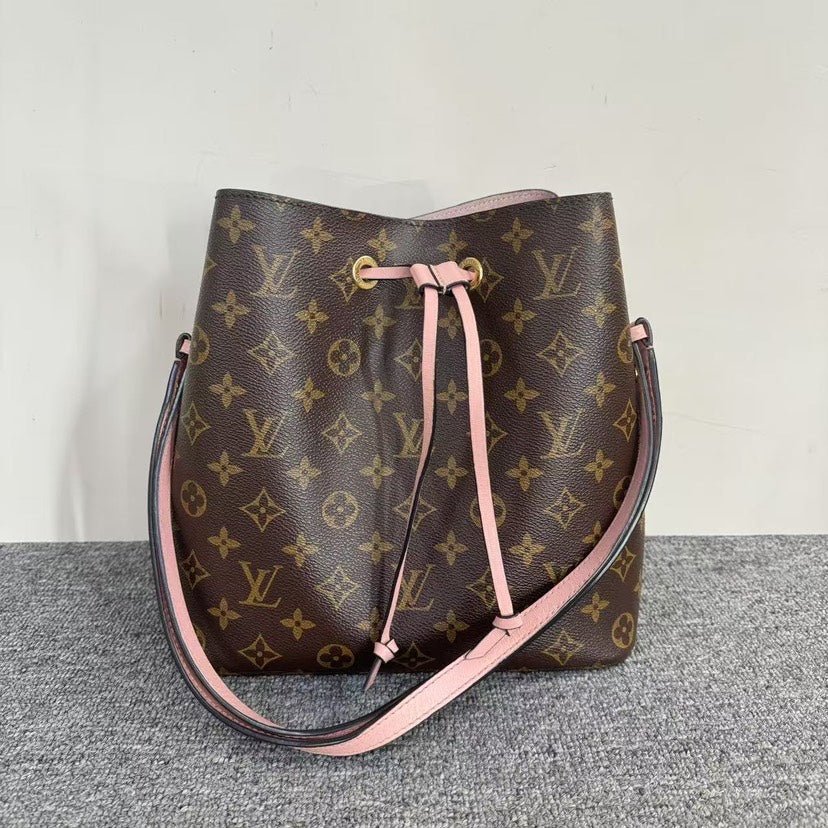 This authentic preloved Louis Vuitton Monogram Bucket Bag is a timeless addition to any collection of vintage Louis Vuitton bags. Crafted from iconic monogram leather, it features a drawstring closure and a pink leather strap for easy carrying. The beige textile interior offers ample space for essentials, making it perfect for daily use. Explore our selection of used designer handbags to find a piece that enhances your style and sophistication.