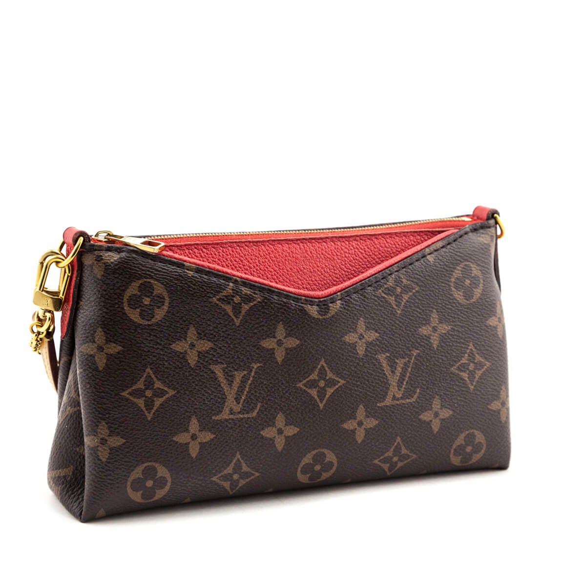 This Louis Vuitton Pallas Clutch reimagines the brand’s classic print with a sophisticated and contemporary twist. With a slim frame composed of the brown LV monogram coated canvas, this preBlara Bagsd Louis Vuitton handbag complements its earth-toned body with red calfskin details, gold-tone hardware, and beige cowhide trim throughout. Stay organized on the go via the front wall’s V-shaped cutout red calfskin slip pocket. Carry this preBlara Bagsd LV handbag on-shoulder or wear as a wristlet with the chain-link strap, or attach the flat cowhide strap for a crossbody wear option. Securing with a zip-top closure, the red canvas-lined interior offers organization in one slip pocket at the rear wall. This preBlara Bagsd Louis Vuitton Monogram Cherry Pallas Clutch offers the versatility to elevate everything in your collection.