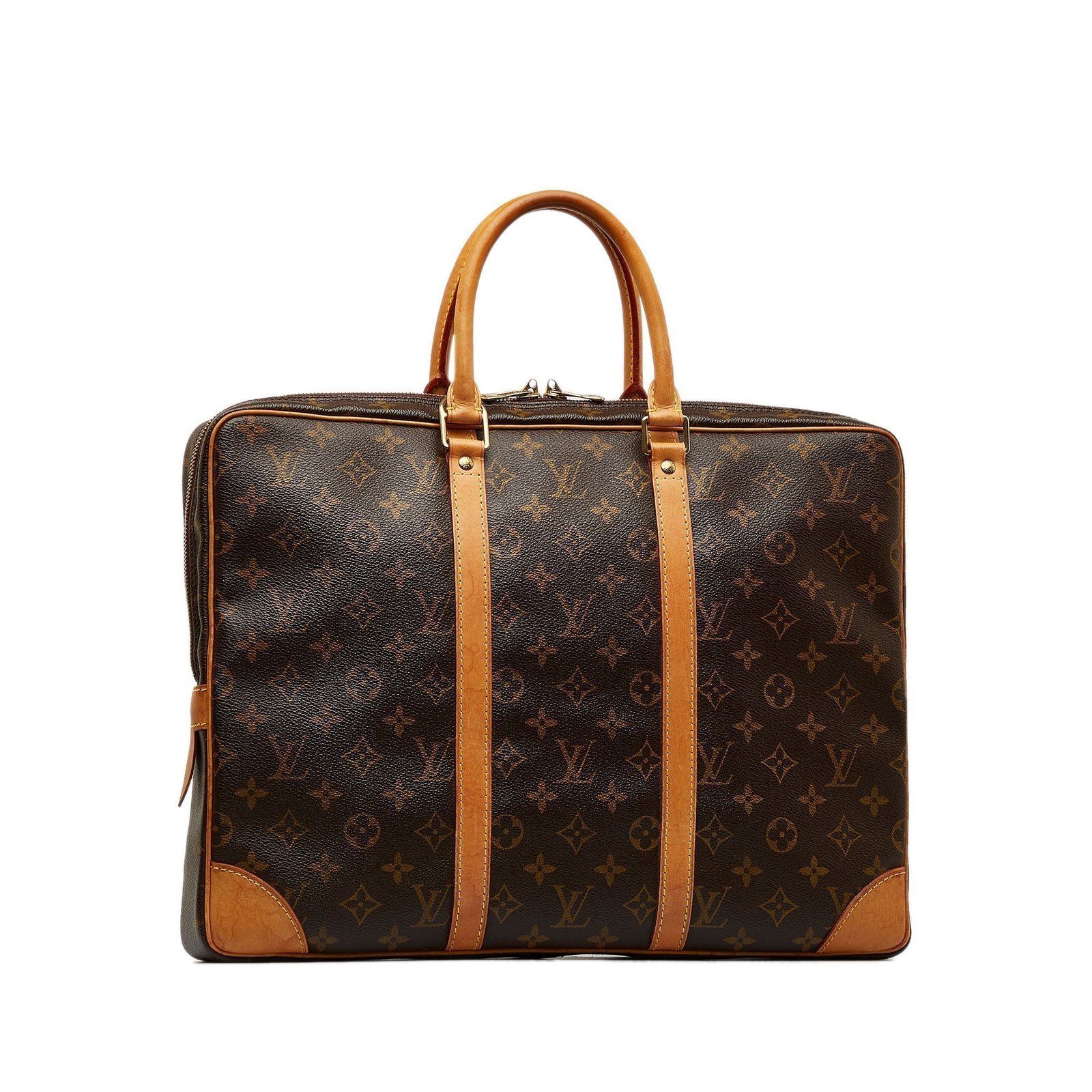 The Porte-Documents Voyage features a monogram canvas body, vachetta trim, rolled leather handles, top zip closure, and interior zip and slip compartments Comes with dust bag