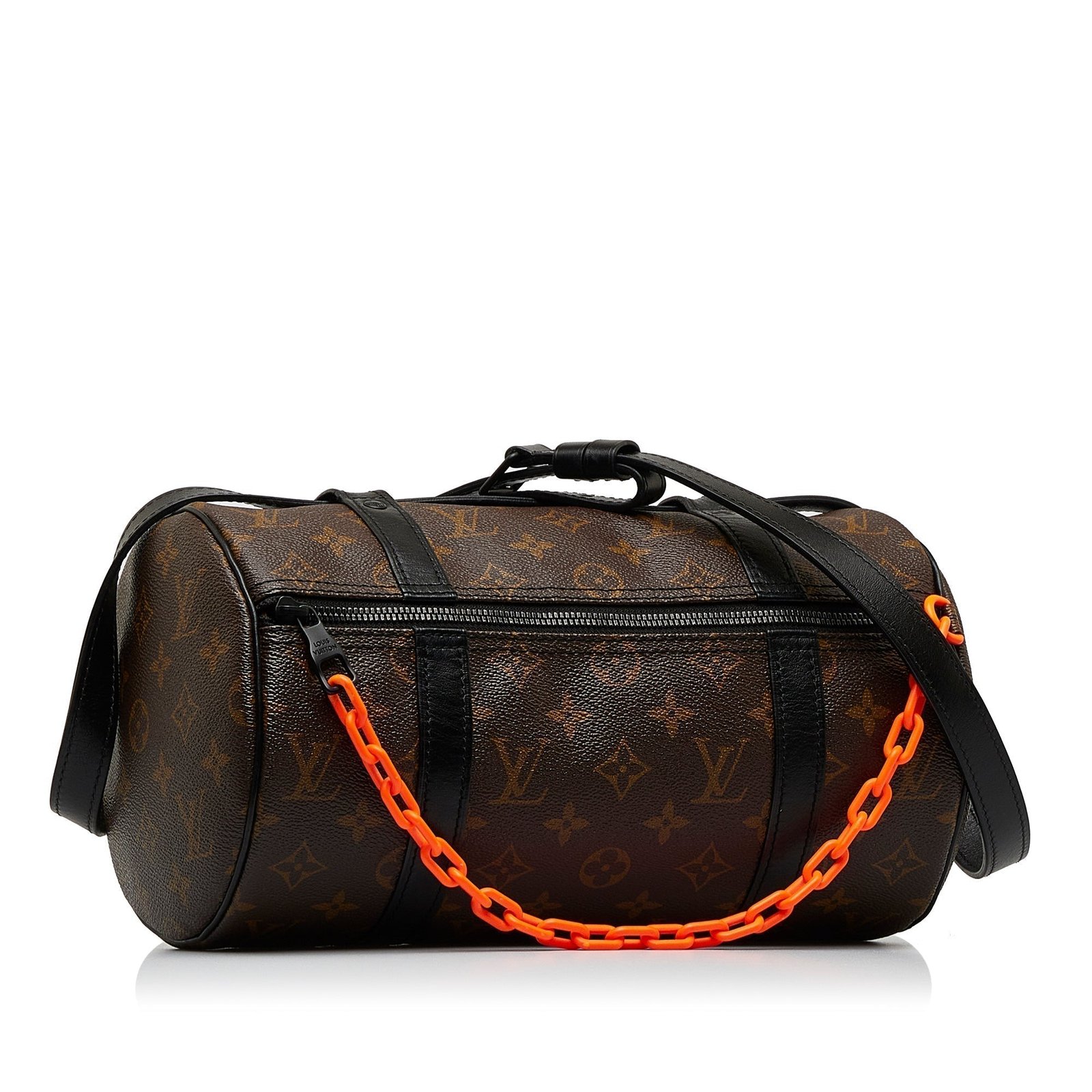 The Papillon features a monogram canvas body with leather trim, a plastic chain handle, an adjustable flat leather strap, and a top zip closure. Comes with dust bag