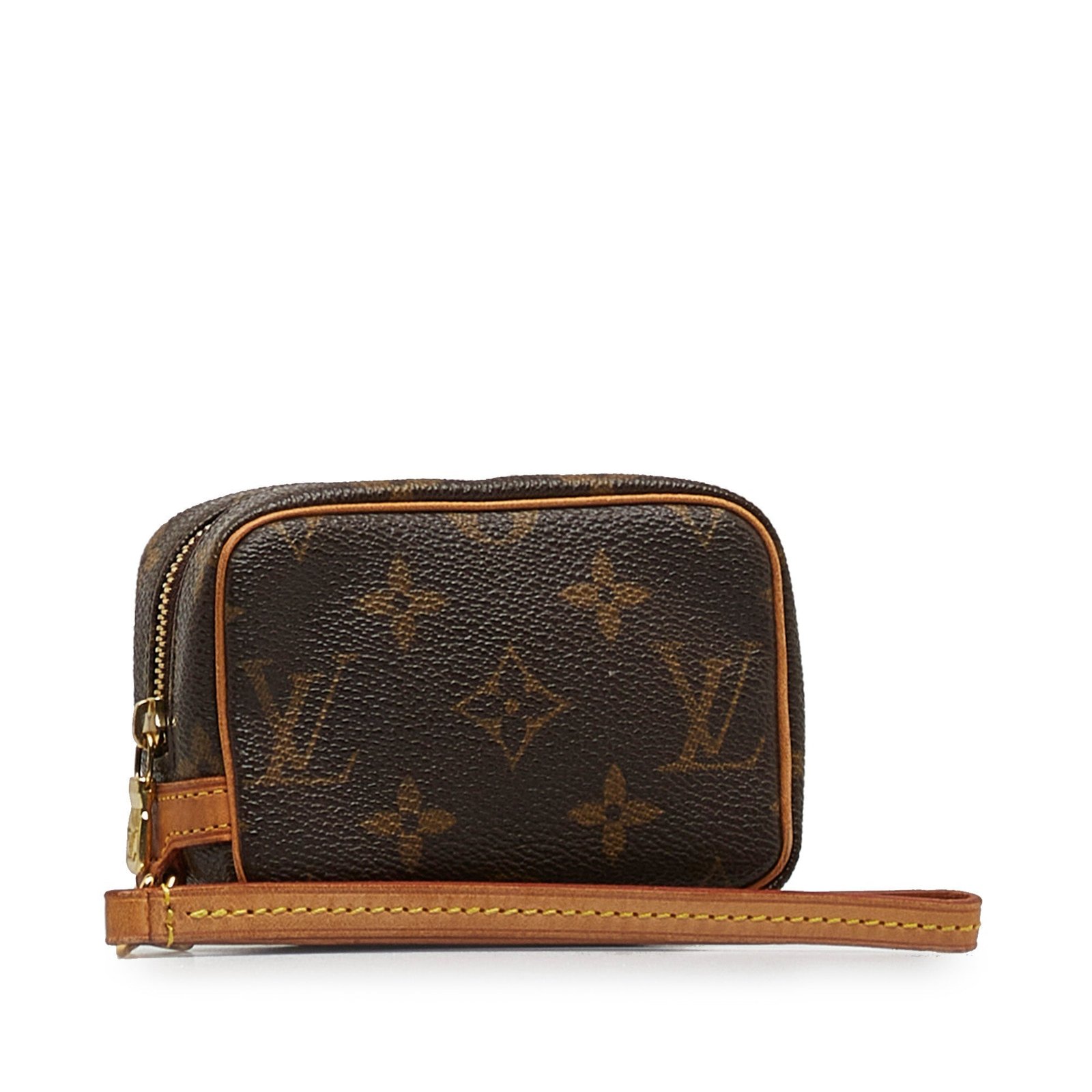 The Wapity features a monogram canvas body with vachetta leather trim, a flat vachetta leather wrist strap, and a top zip closure.