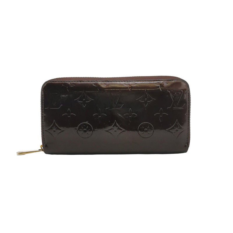 This is an authentic LOUIS VUITTON Vernis Wallet. This elegant wallet is crafted from Louis Vuitton’s distinctive monogram-embossed vernis leather in a rich brown color. It features a gold-tone zip closure and multiple interior compartments to securely organize your essentials. The wallet’s compact and stylish design makes it a perfect accessory for any occasion.