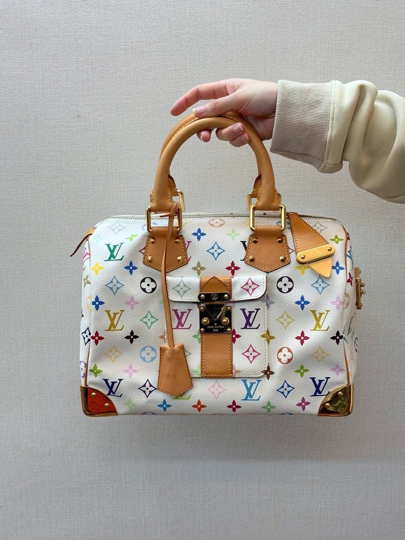 This is an authentic LOUIS VUITTON Multicolor Speedy 30 Bag. This stylish bag is crafted of Louis Vuitton’s signature multicolor monogram canvas on white. The satchel features vachetta cowhide leather top handles and trim with polished brass hardware. The top zipper opens to a spacious interior for day or evening essentials with the luxury and style of Louis Vuitton!