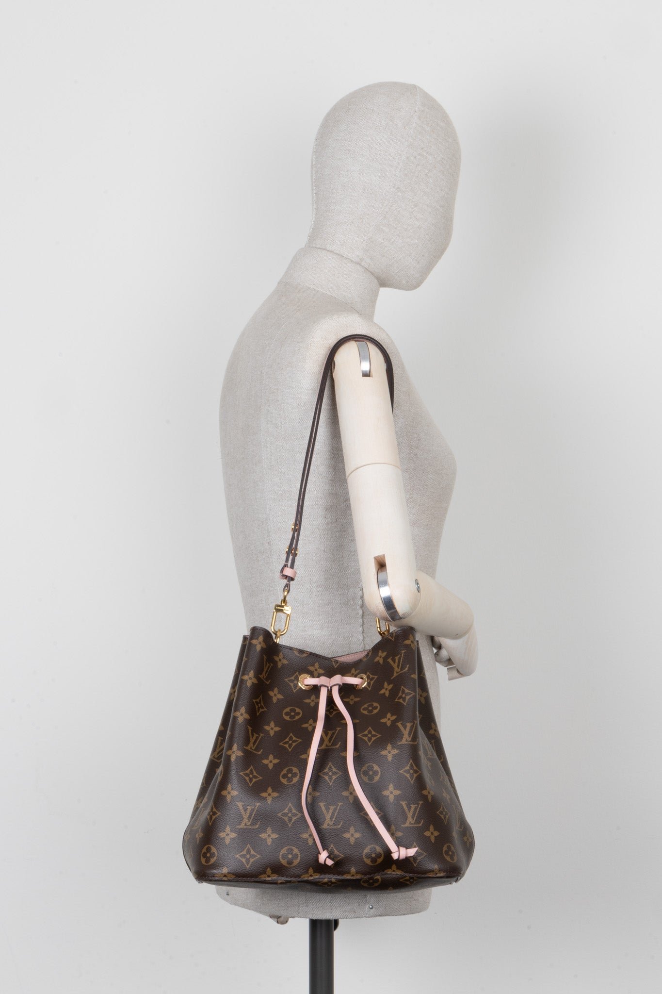 Diese Louis Vuitton Néo Noé ist eine stilvolle Neuinterpretation des klassischen Noé-Designs aus der Louis Vuitton Kollektion. Mit einer zarten Rose Poudre-Farbgebung und dem klassischen Monogram Canvas, erlangt diese Tasche einen eleganten und femininen Look. Ursprünglich als Champagner Tasche entwickelt, vereint funktionale Details mit modernem Design.