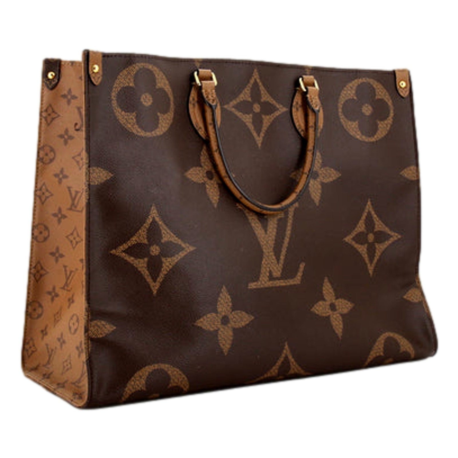The Louis Vuitton On The Go Tote Reverse Monogram Giant GM is a stunning, oversized handbag that combines sophistication and practicality. Featuring the iconic Reverse Monogram Giant canvas, the bag contrasts the classic LV monogram in a bold, oversized pattern, with the signature LV and floral motifs in dark brown on a beige background. This unique design creates a modern, eye-catching twist on Louis Vuitton’s classic heritage.