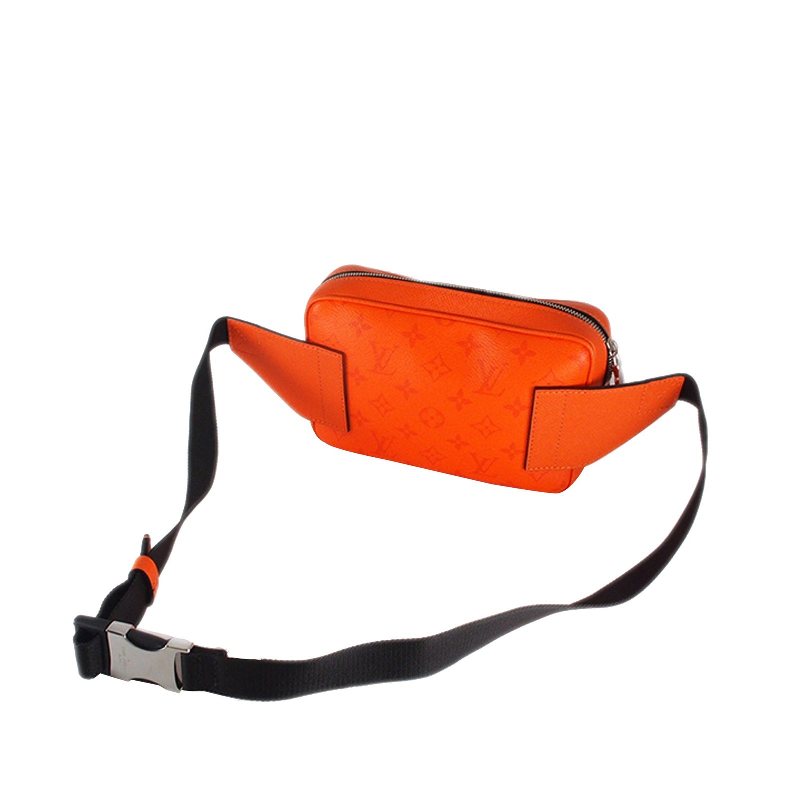 This Louis Vuitton outdoor fanny pack is crafted of orange Monogram Taïgarama leather and features silver details, an adjustable waist strap, a Bag zipper closure on the front, and a zipper closure on the top opening. The Bag is at the waist or optionally across the body.