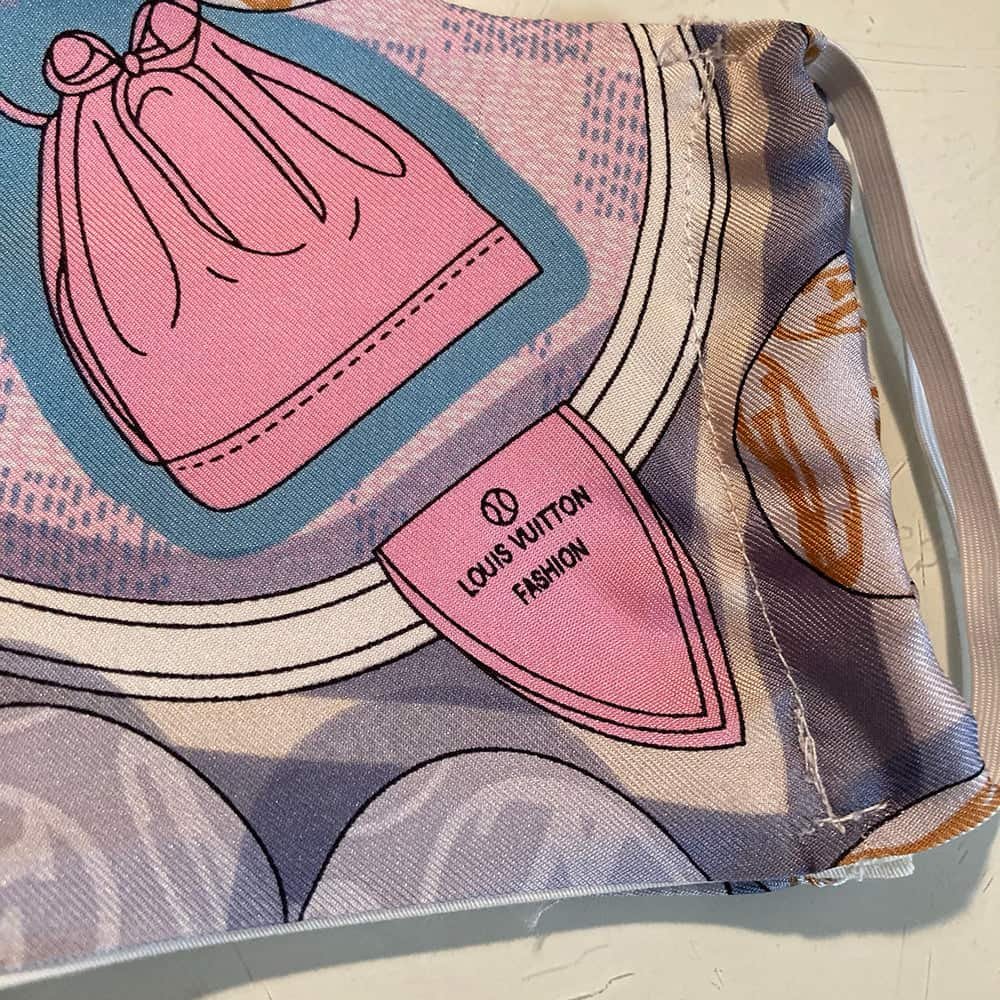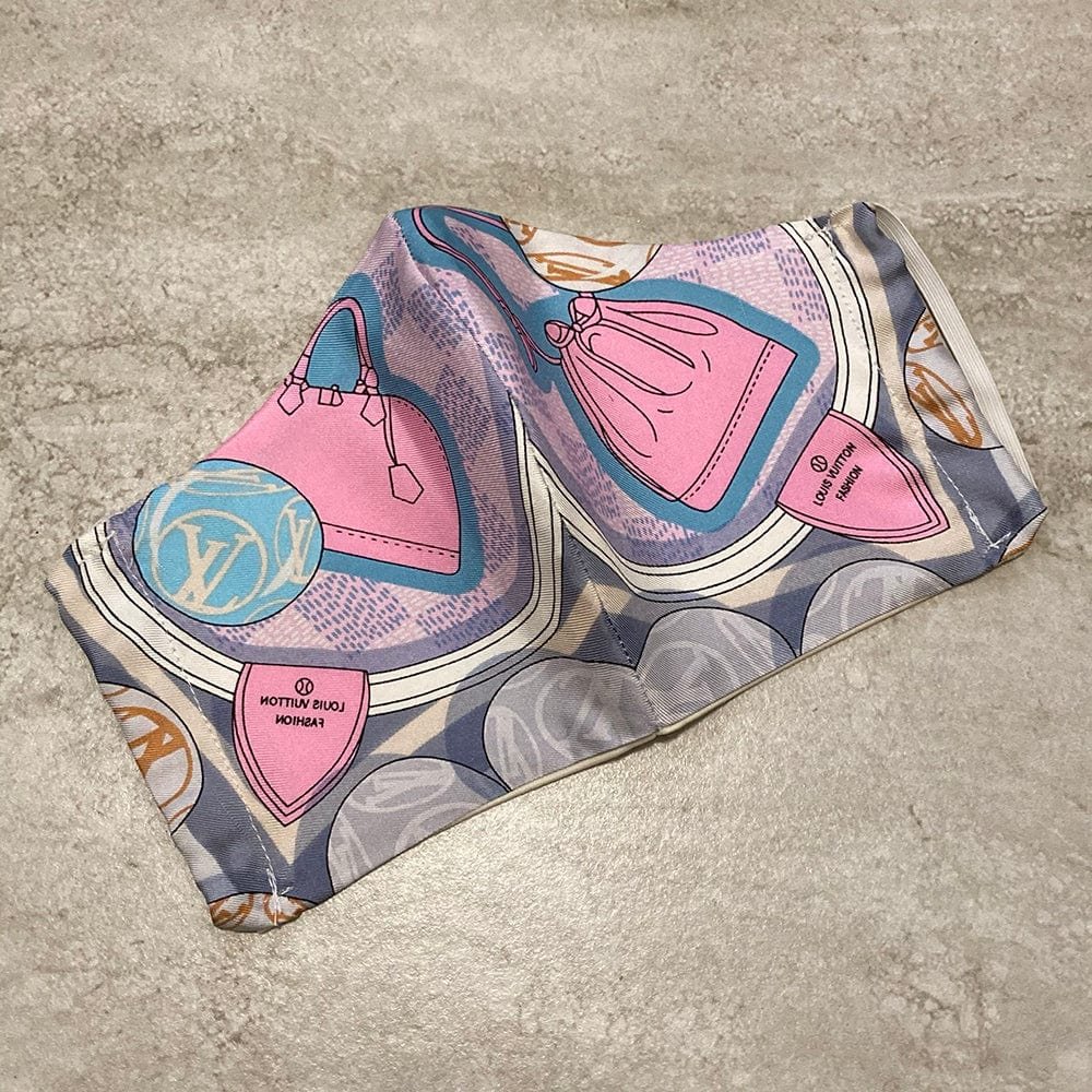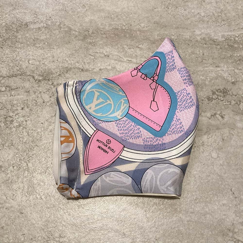 LV Pinball Silk Scarf reinvented into a face mask. Pretty Pastel colors with LV handbag print throughout. Mask features a pink noe bag on right side and pink alma on left. Both surrounded by checkered damiere pastel pattern. Blue LV pinball on right side. White border surrounds and pink tab mirrored on both sides with lv title logo.