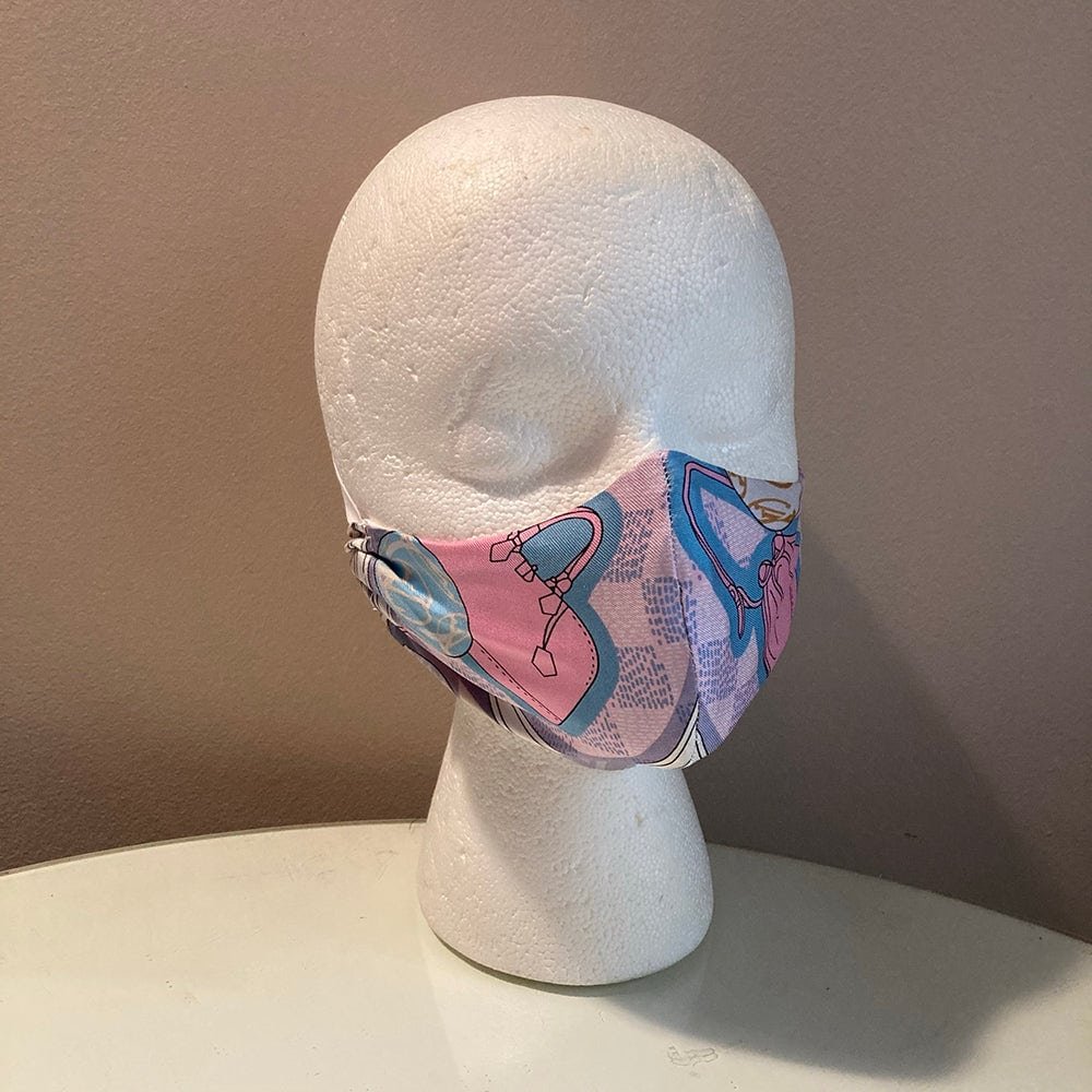 This is an original, reconstructed, handmade item cut from an LV silk scarf and professionally produced by our in-house specialty brand ‘Vintage Reinvented’ in Philadelphia PA, USA. No stains, smells or fabric pulls. Each mask features an outer layer of silk twill lined with cotton with filter pocket in between. Elastic ear straps for easy and comfortable wear. PM2.5 activated carbon filter included.