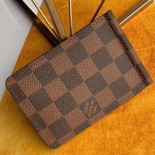 The Pince wallet in stylish brown Damier Ebene canvas is an ultra-slim design that will slip easily into any pocket. In addition to four credit slots and two flat pockets, it features an articulated gold-tone metal clip to securely hold banknotes or tickets.