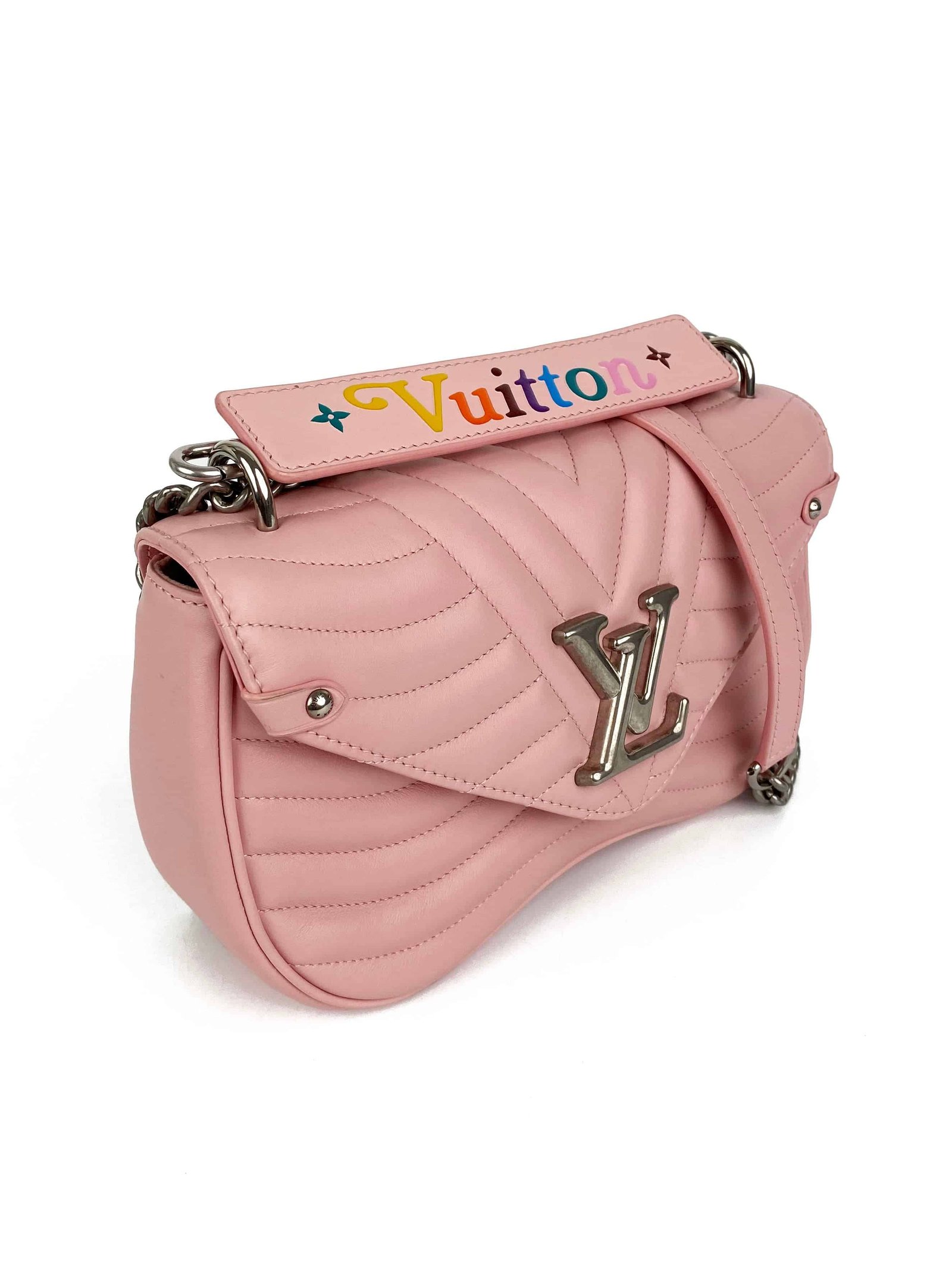 Description : Gorgeous pink bag from the New Wave collection. This bag features a wave shaped bottom with a pointed flap and handle reading ‘Vuitton’ in rainbow letters. Purchased in 2019 from Melbourne, Australia. In excellent condition; mild signs of wear, colour transfer from hardware on outer areas.