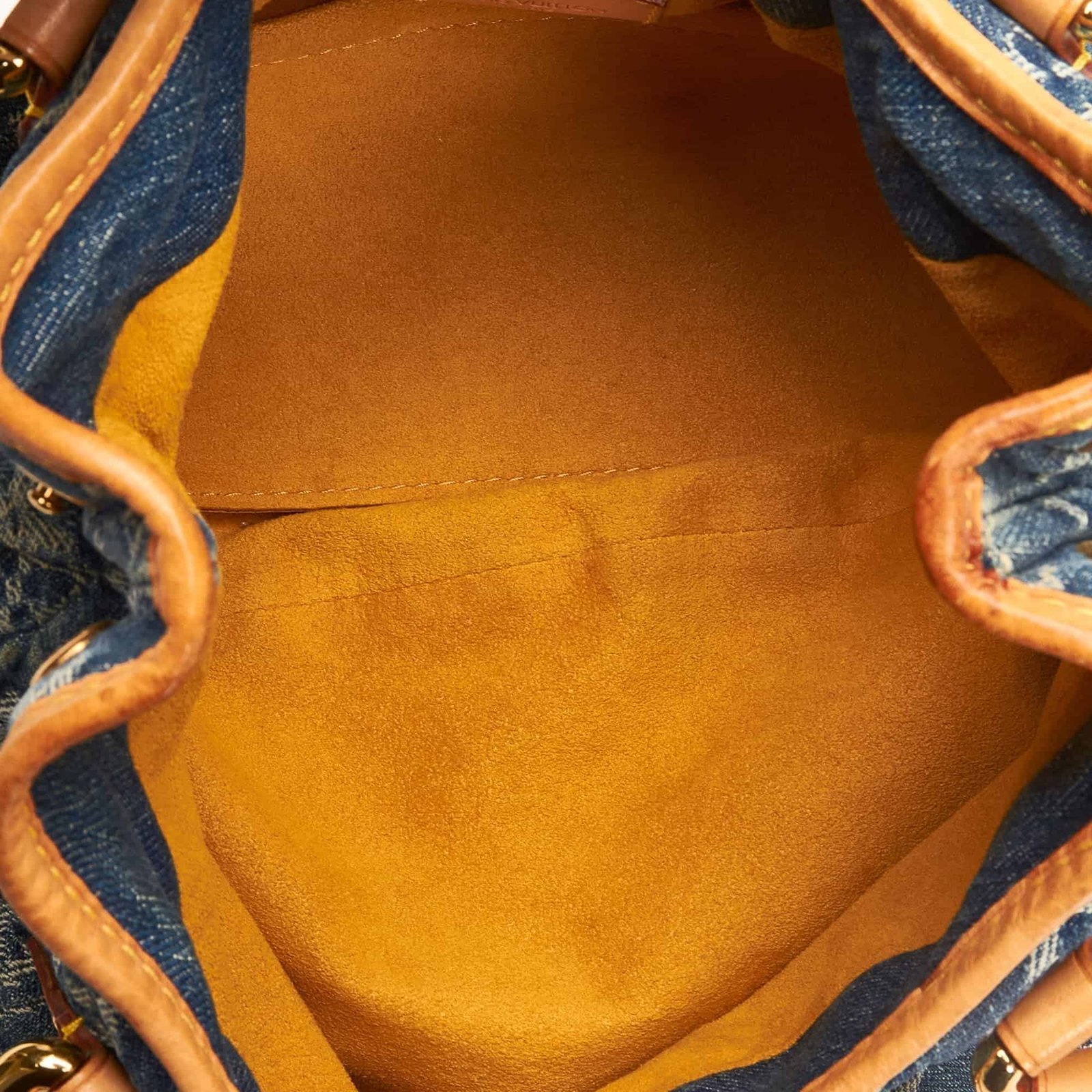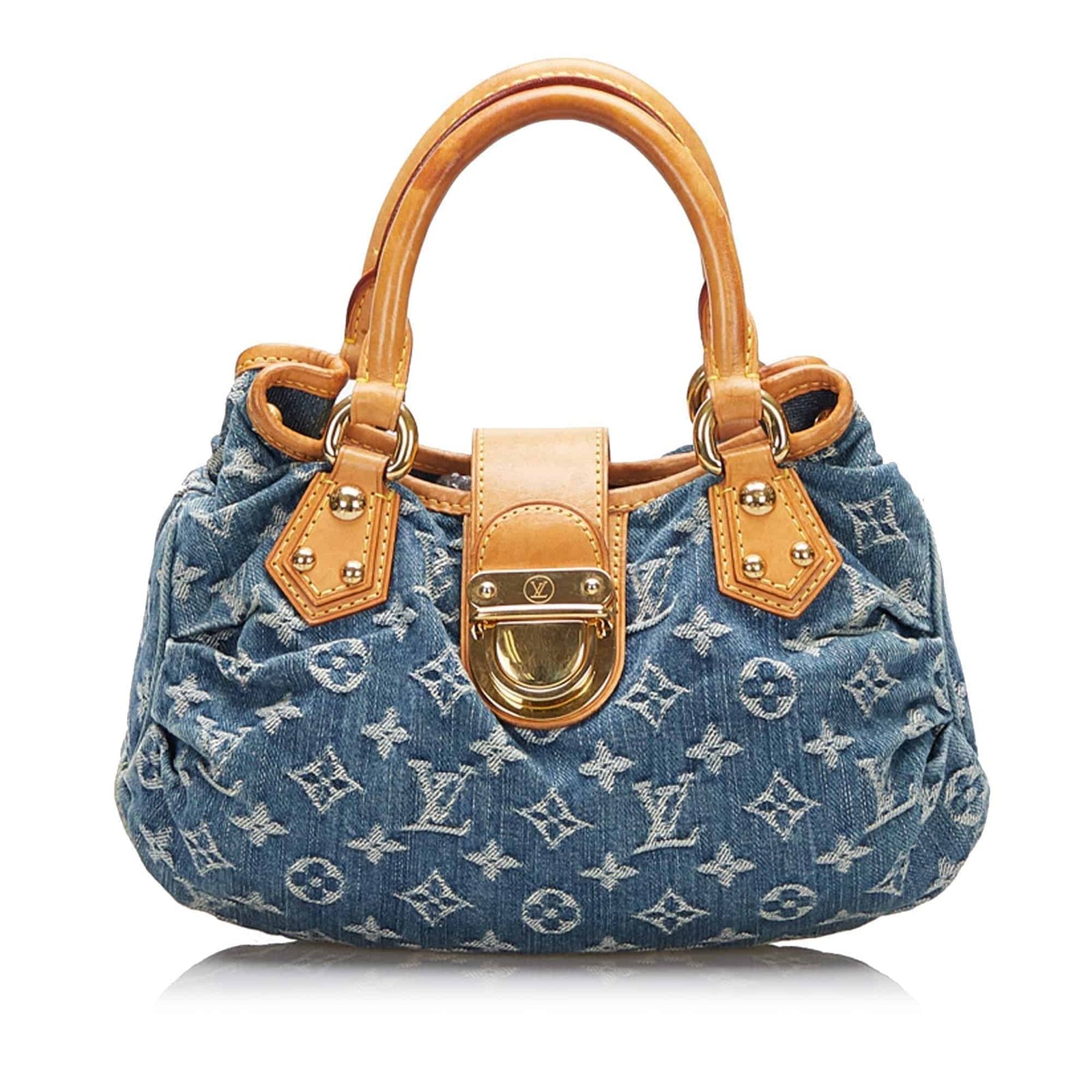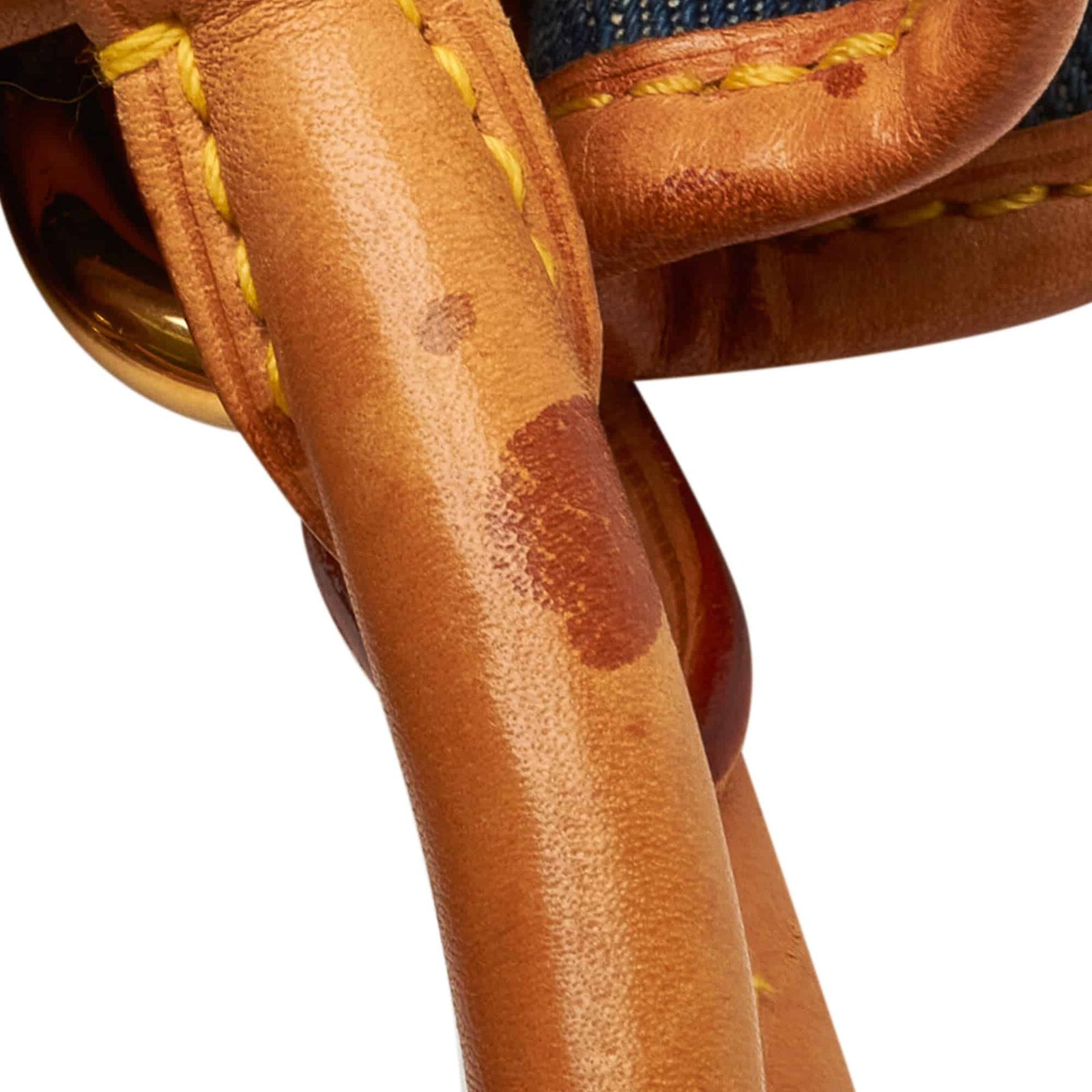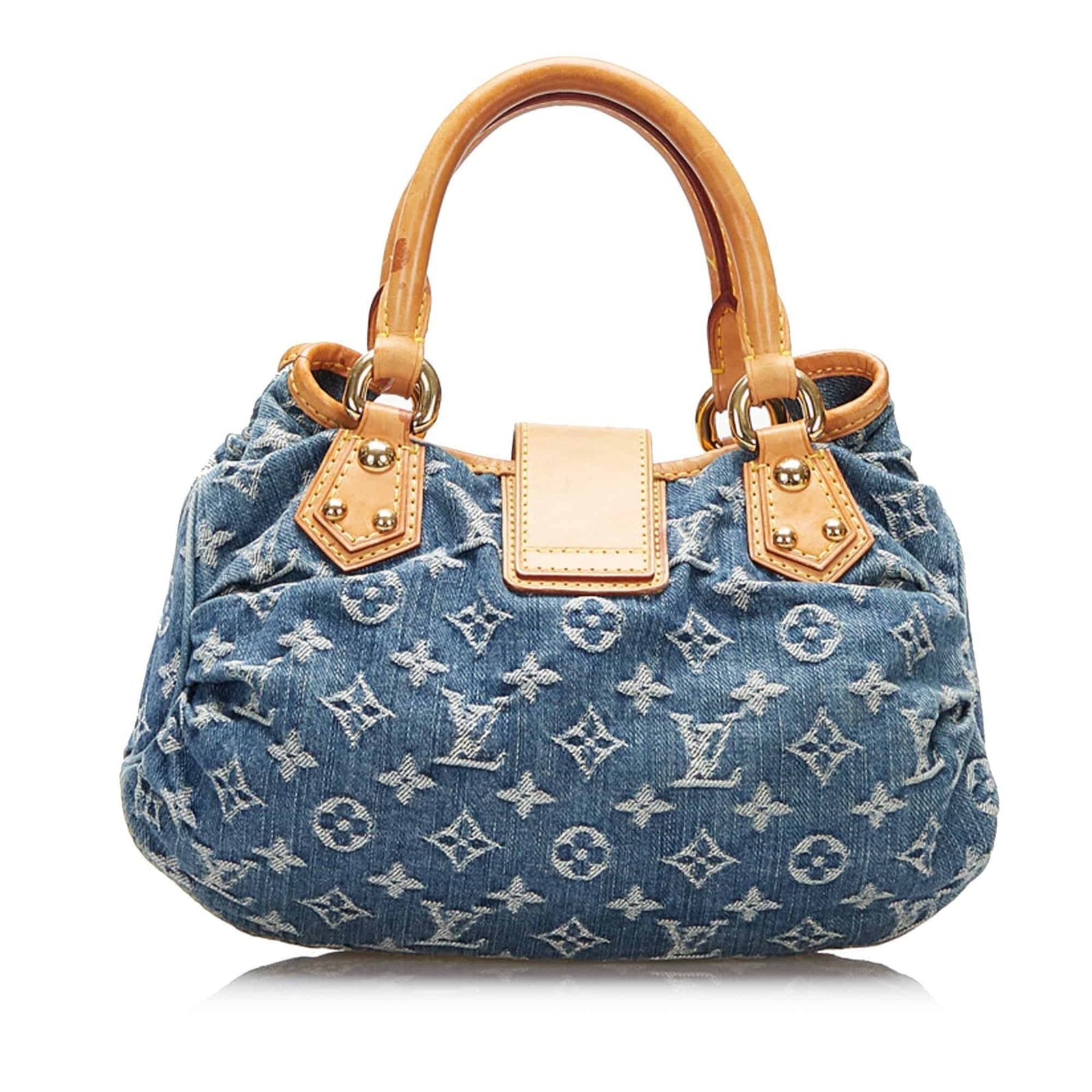 This pretty Louis Vuitton pleaty was made from blue monogram denim. The Bag features brown vachetta leather trim and rolled handles, gold studs and rings, and a sliding closure, also gold, on a strap above the top opening. The Bag is carried in the hand or arm.