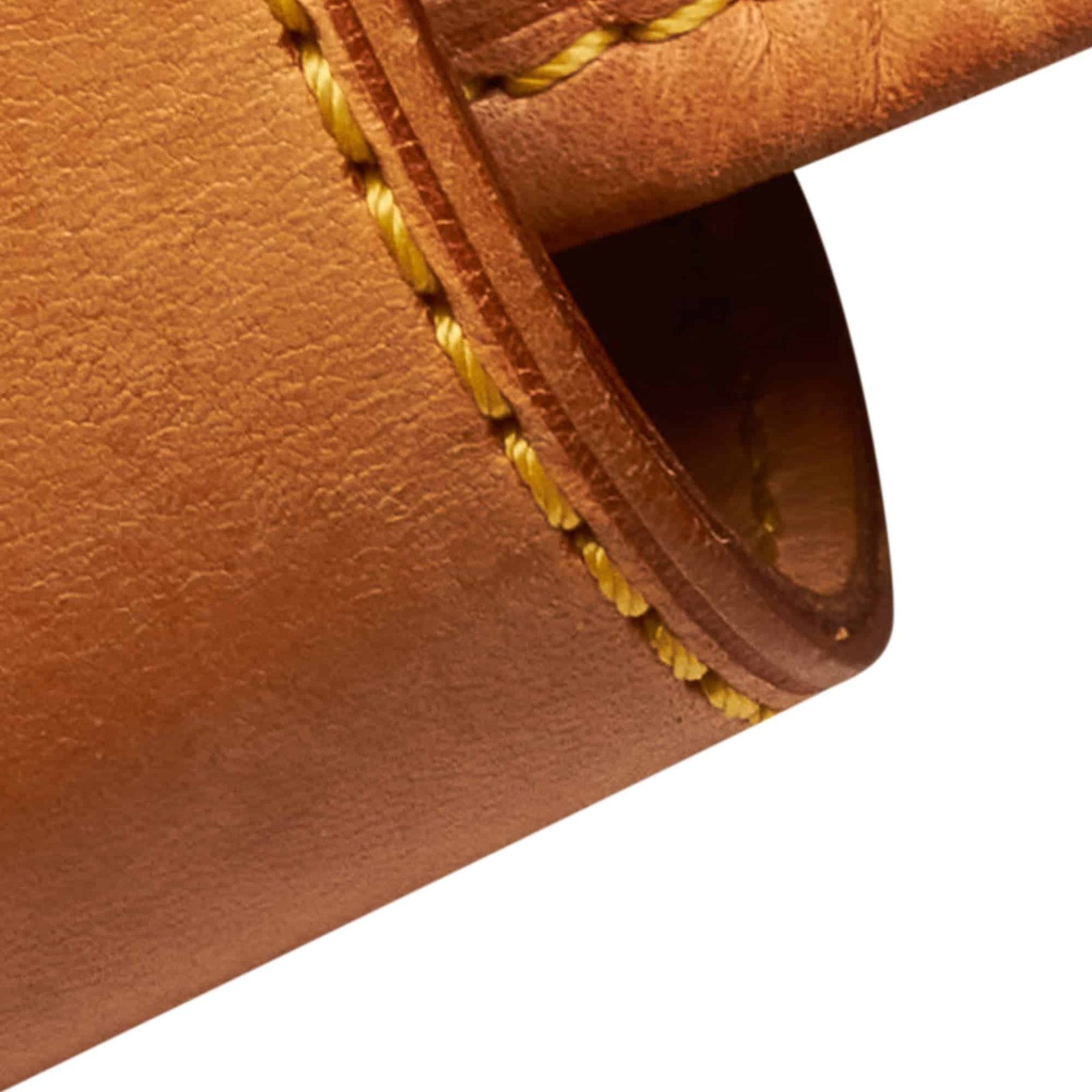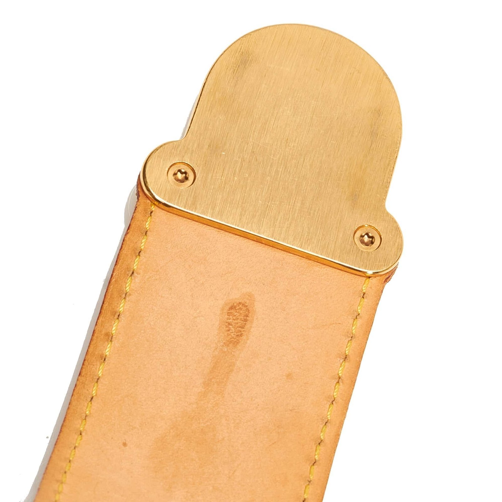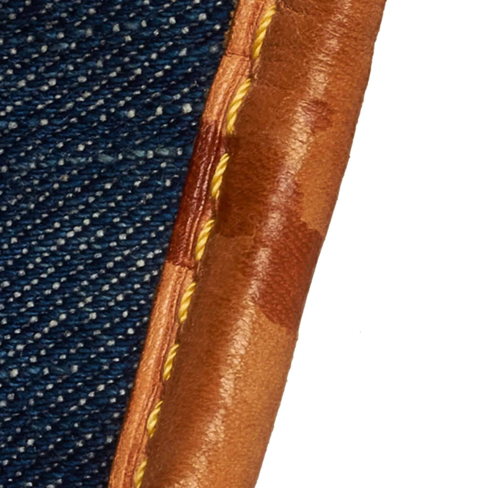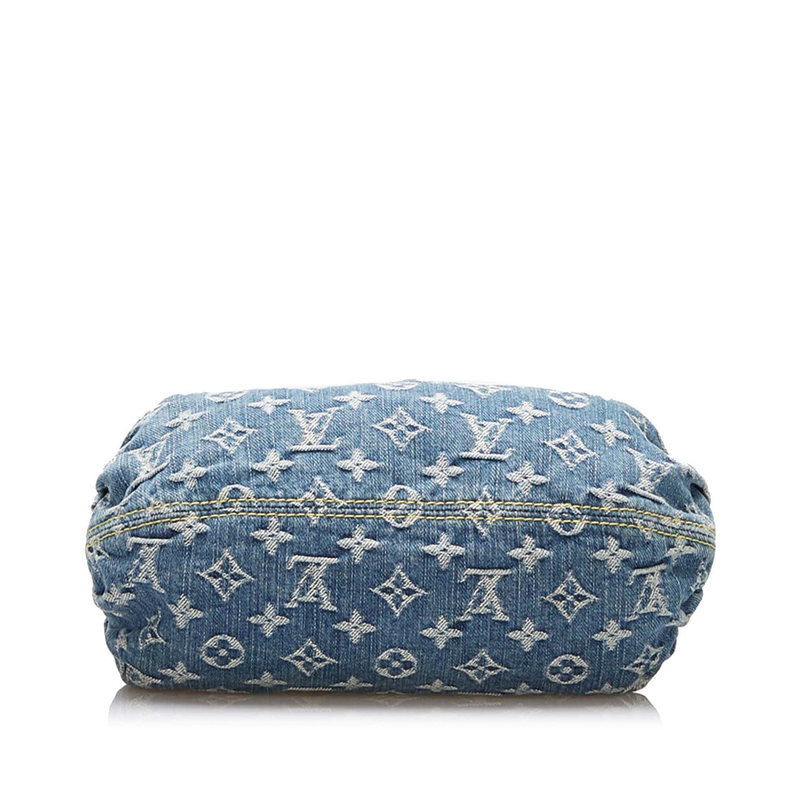 This pretty Louis Vuitton pleaty was made from blue monogram denim. The Bag features brown vachetta leather trim and rolled handles, gold studs and rings, and a sliding closure, also gold, on a strap above the top opening. The Bag is carried in the hand or arm.