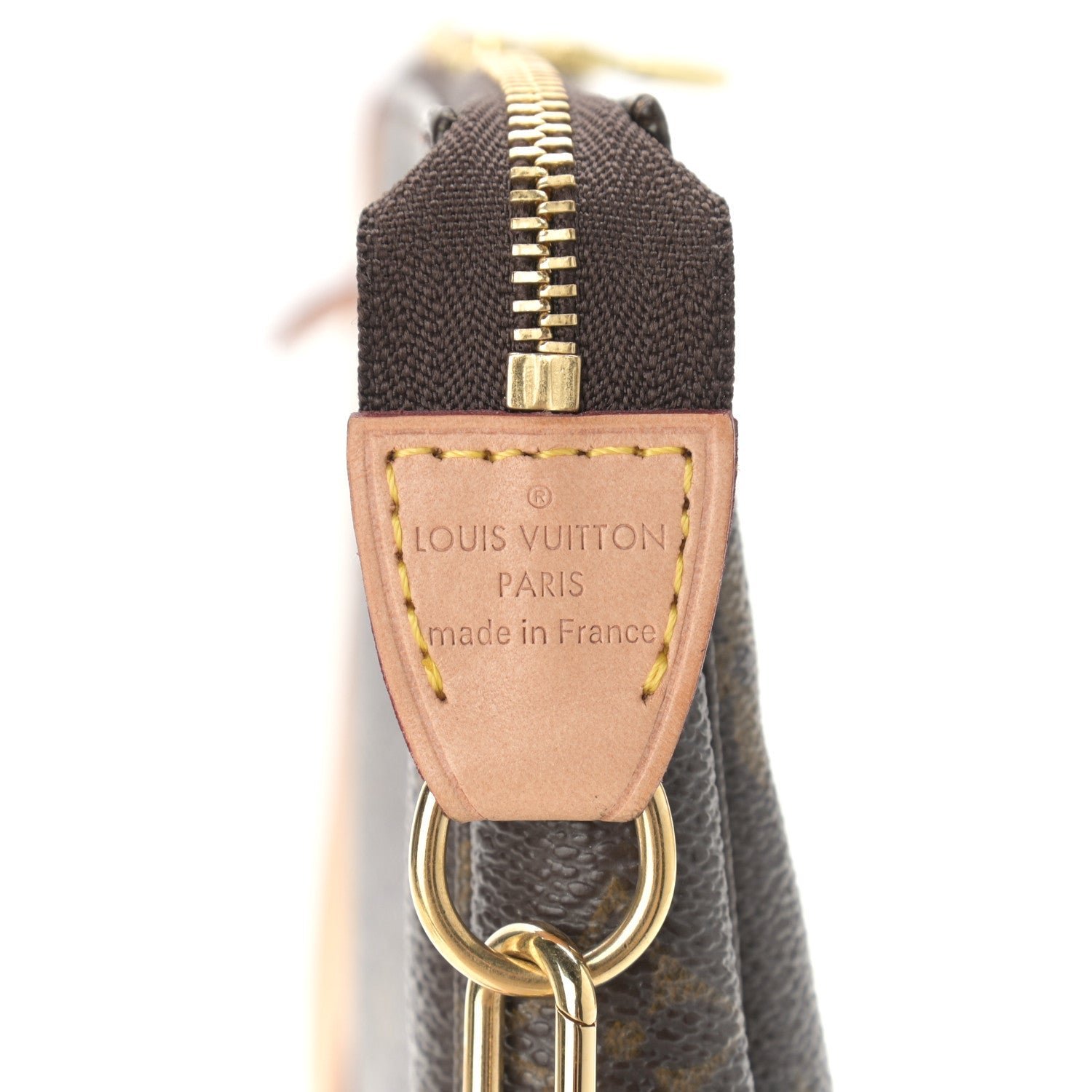 This pouch is crafted of signature Louis Vuitton monogram coated canvas. The polished brass top zipper opens to a brown fabric interior.