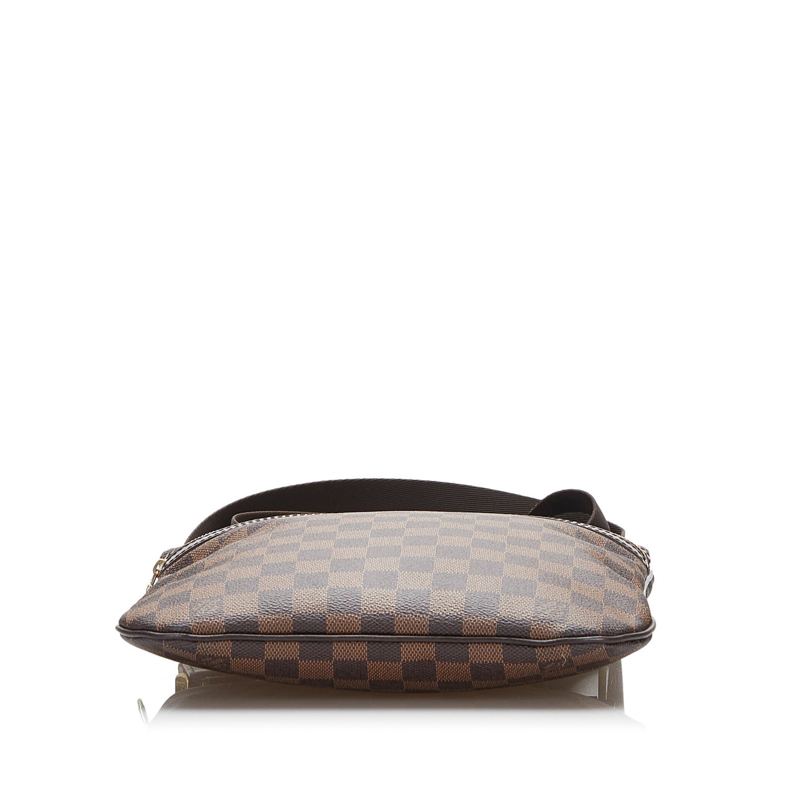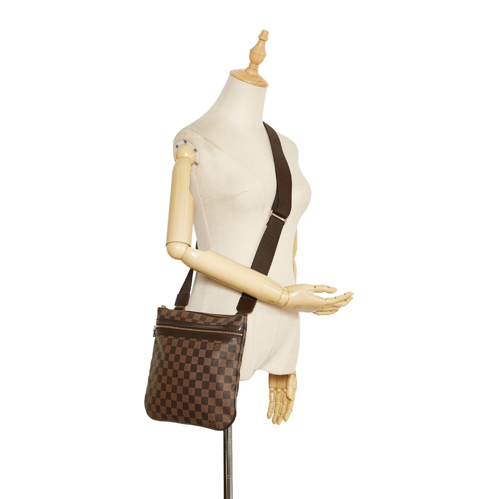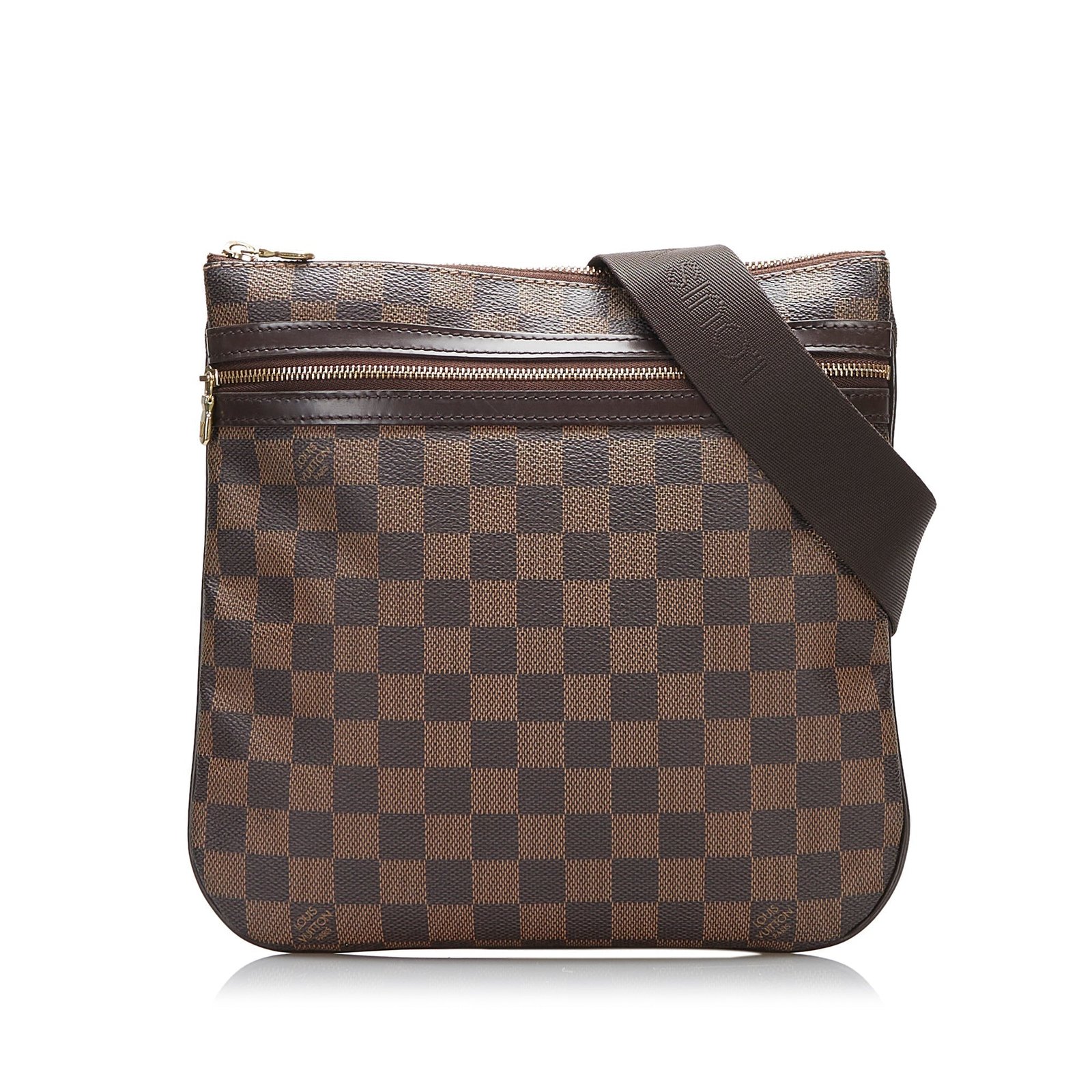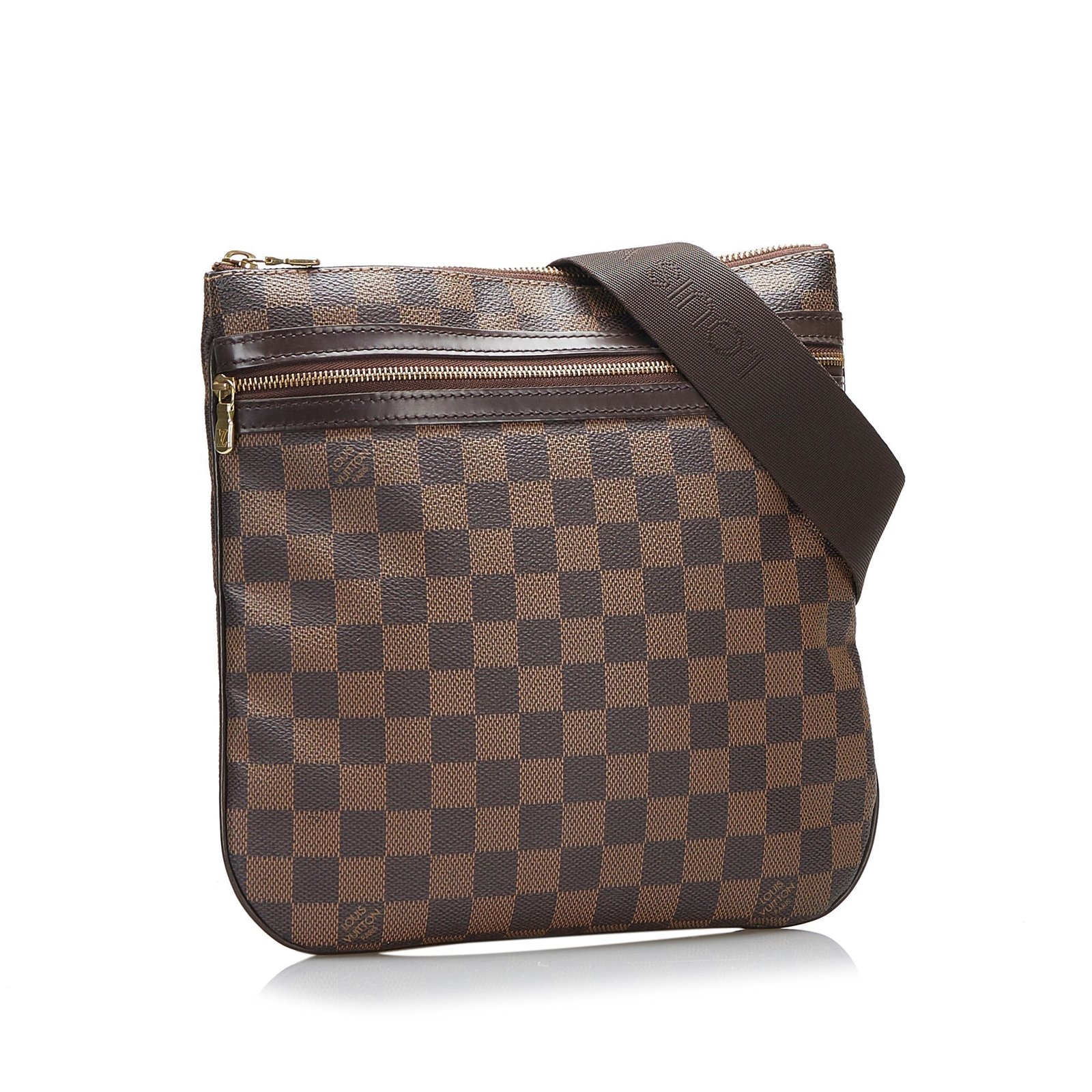 This Louis Vuitton Pochette Bosphore crossbody bag is made of damier level canvas. The Bag features brown leather trim, a Louis Vuitton ribbon shoulder strap, a zippered front pocket, and a zippered top opening.