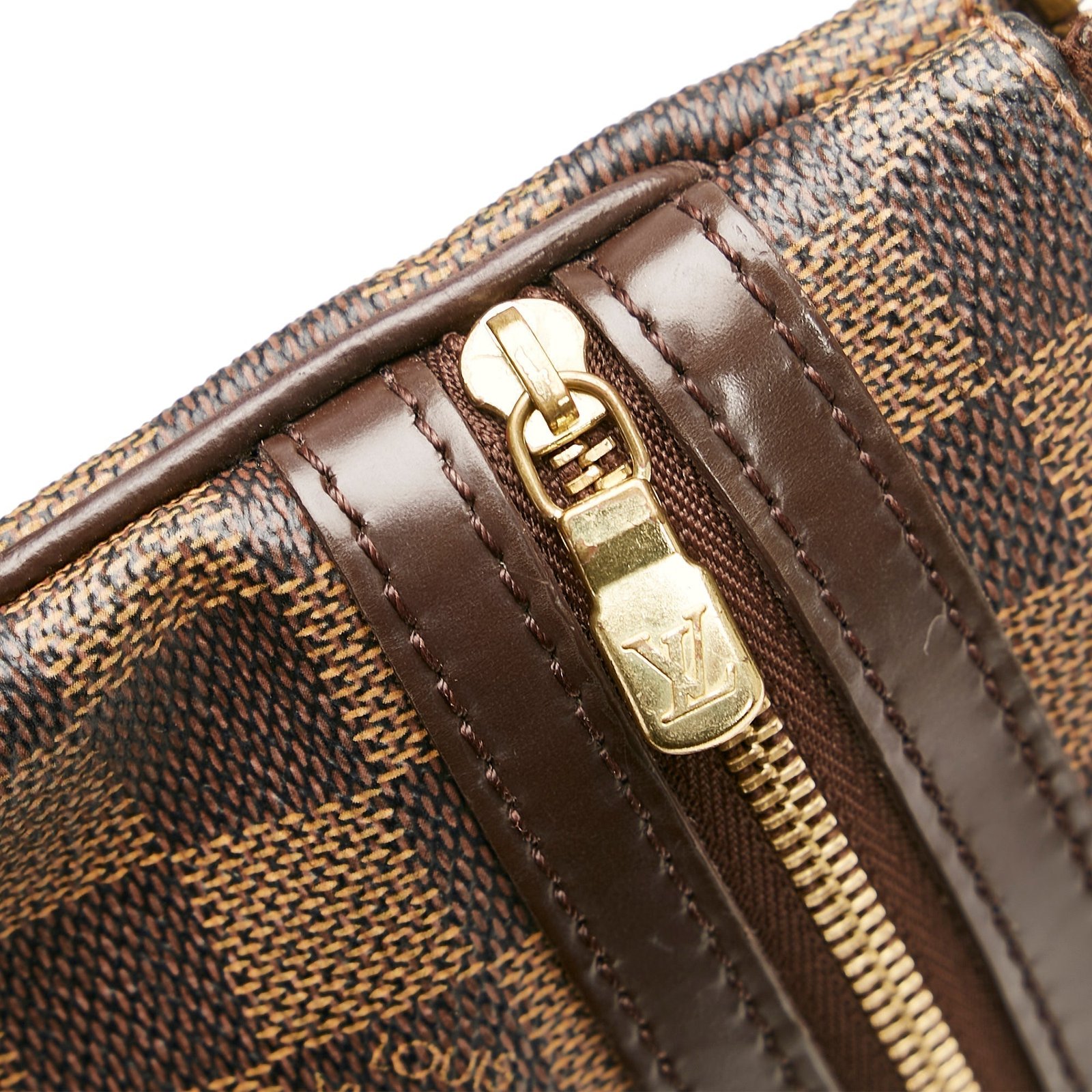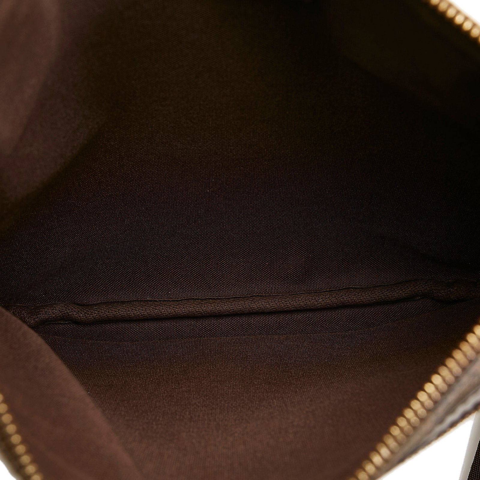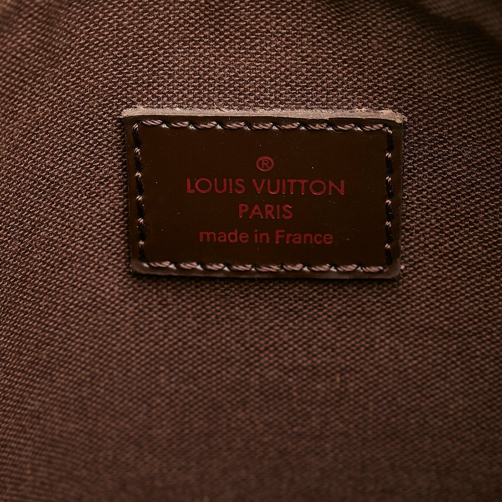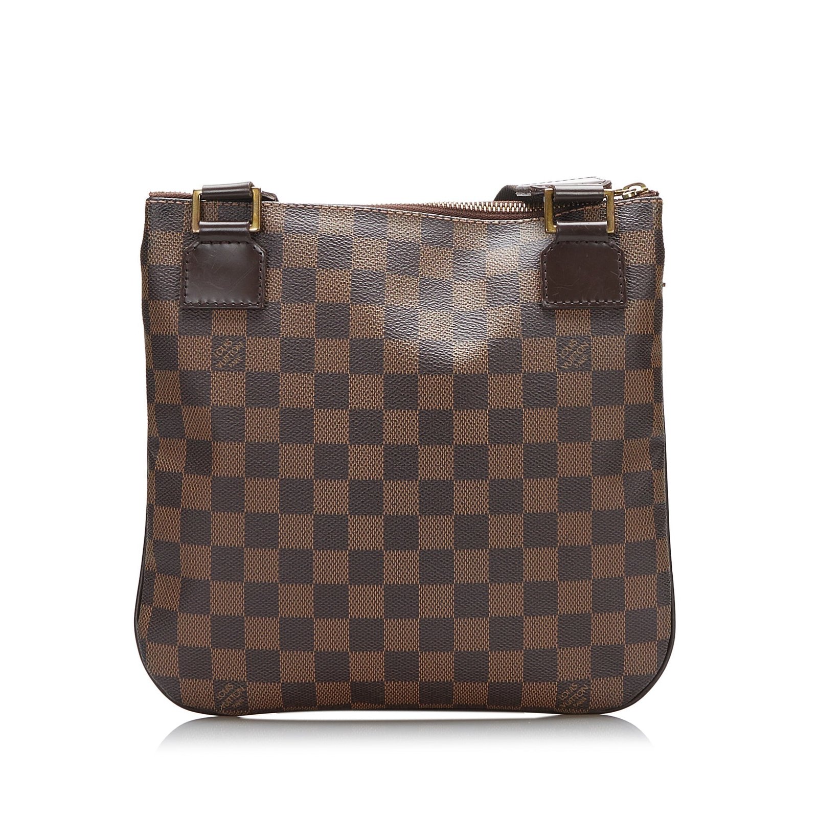 This Louis Vuitton Pochette Bosphore crossbody bag is made of damier level canvas. The Bag features brown leather trim, a Louis Vuitton ribbon shoulder strap, a zippered front pocket, and a zippered top opening.