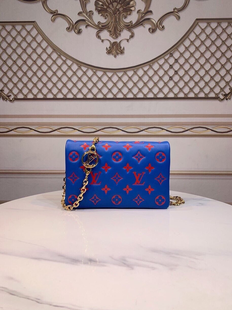 The Pochette Coussin is crafted from soft lambskin, which is embossed with the Monogram pattern to create a puffy, cushiony effect. This is further enhanced by the construction of the pouch, which gives it a supple, body-friendly shape. The removable chain, decorated with a Louis Vuitton charm, offers different carry options: clutch, shoulder or belt.