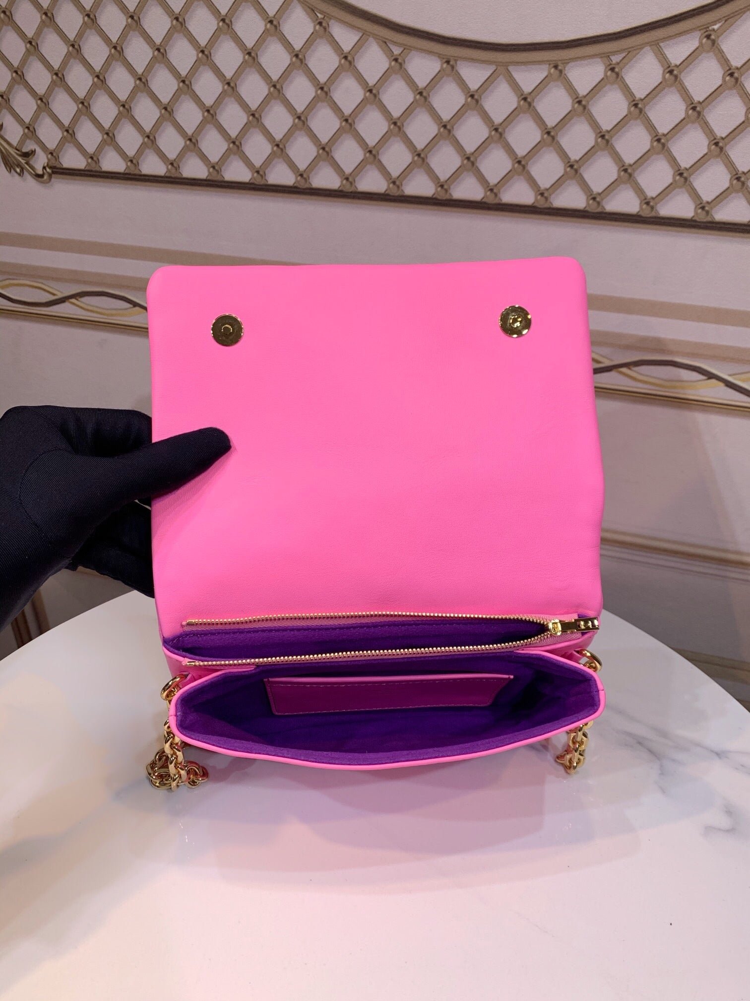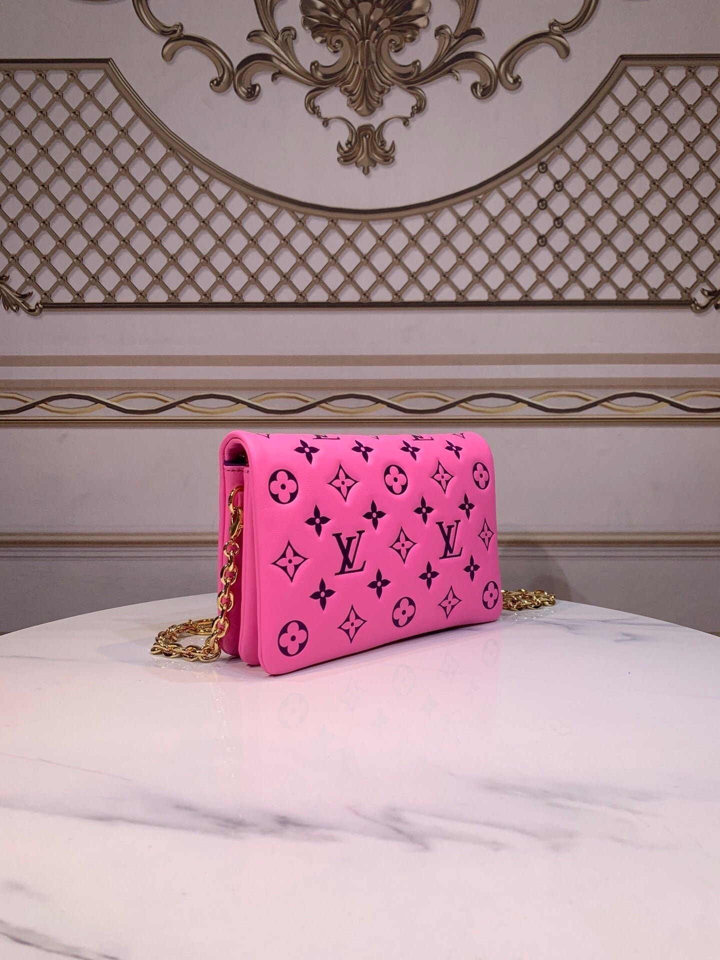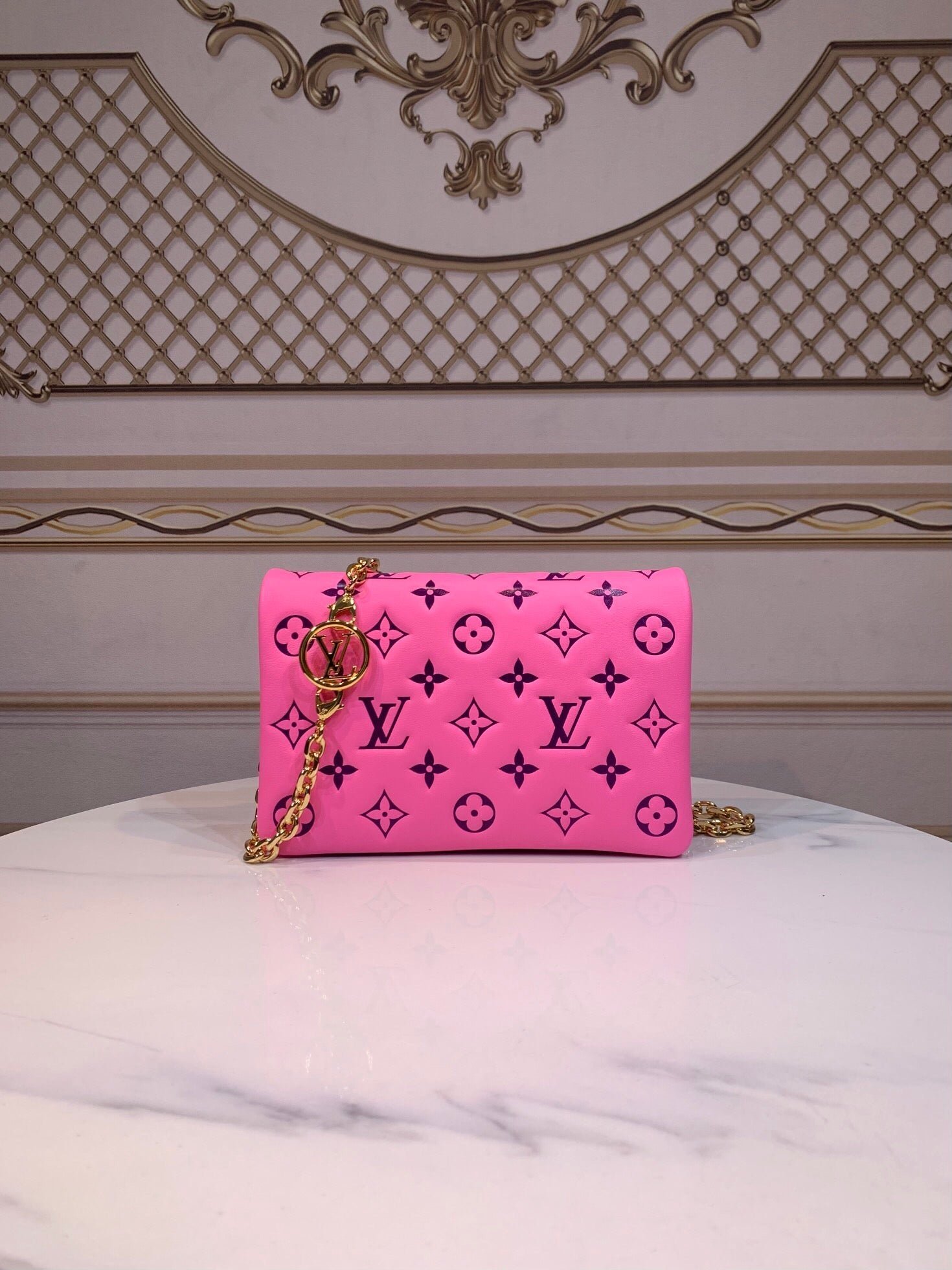 The Pochette Coussin is crafted from soft lambskin, which is embossed with the Monogram pattern to create a puffy, cushiony effect. This is further enhanced by the construction of the pouch, which gives it a supple, body-friendly shape. The removable chain, decorated with a Louis Vuitton charm, offers different carry options: clutch, shoulder or belt.