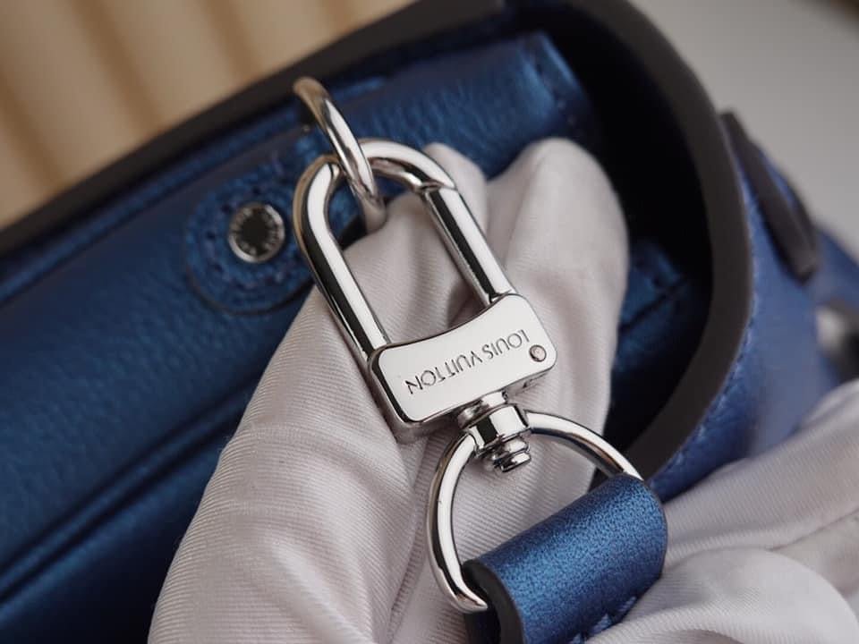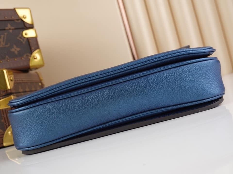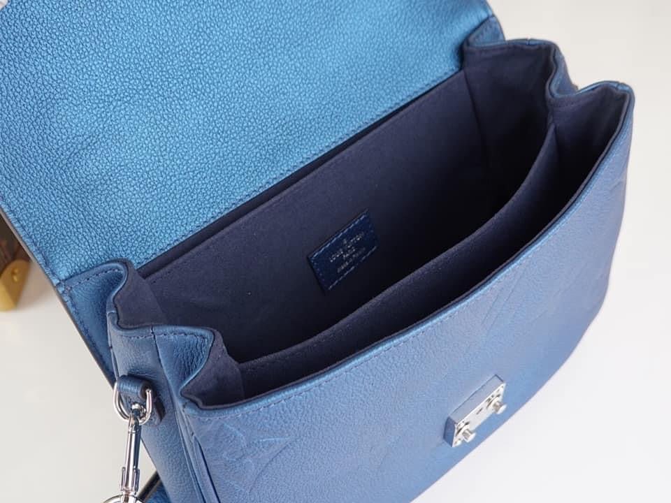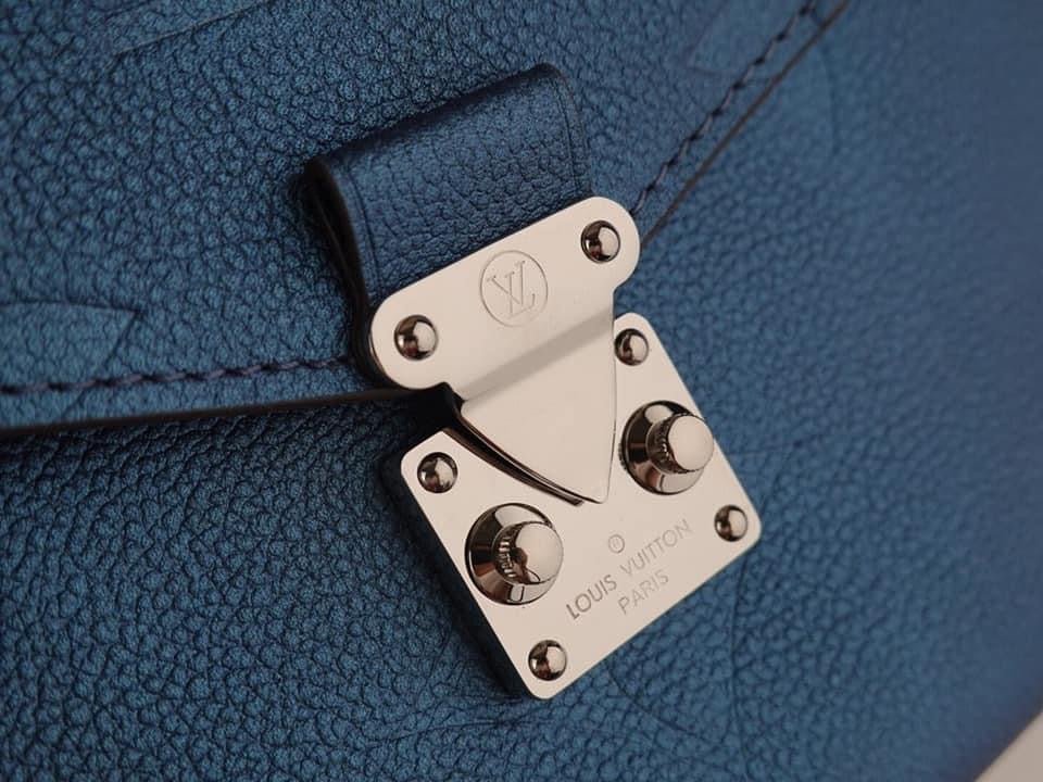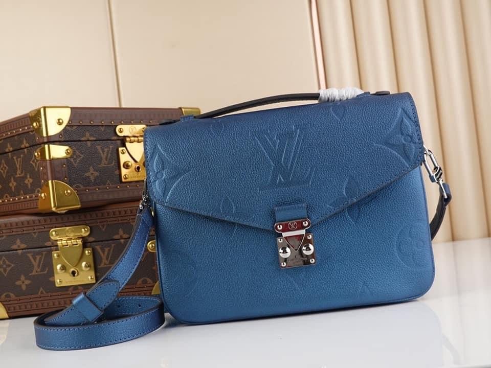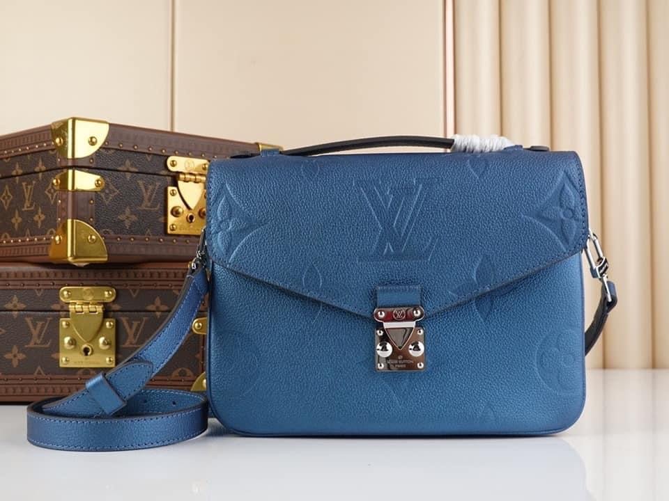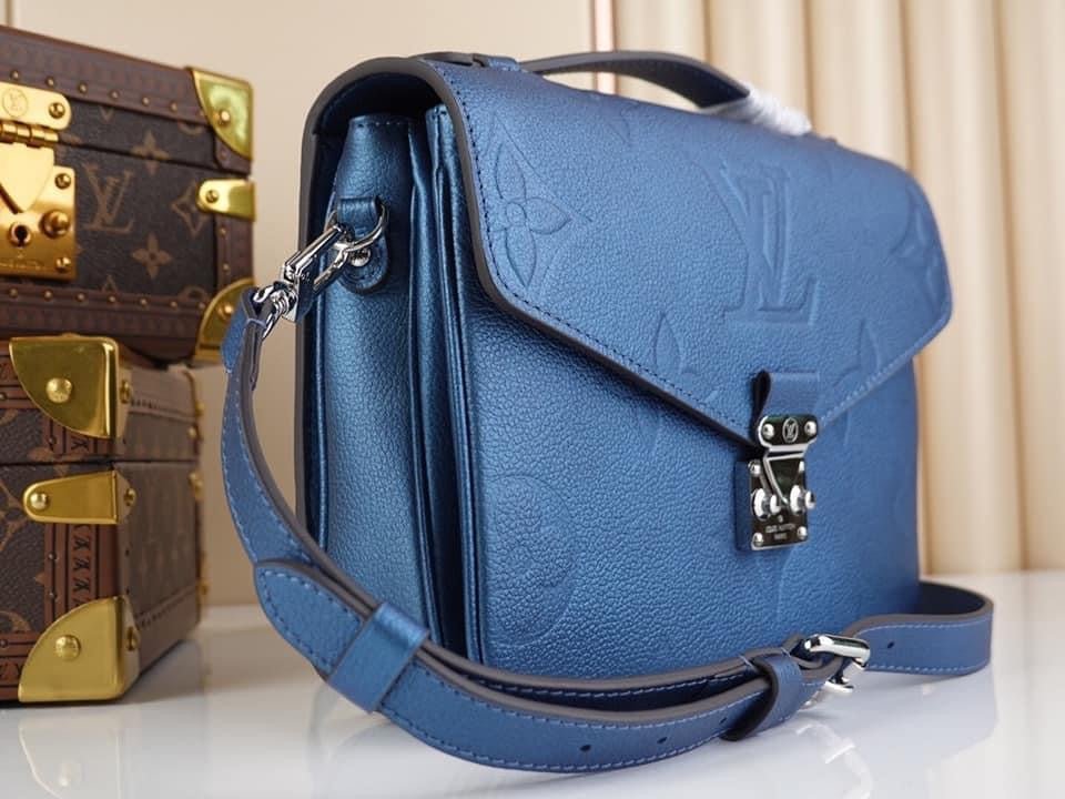 The distinctive Pochette Metis bag is fashioned from shimmering and festive navy-blue Monogram Empreinte leather with an embossed oversized Monogram pattern. This compact satchel bag is unexpectedly spacious. It features a signature S-lock closure and is fitted with a top handle and a long adjustable and removable strap for shoulder or cross-body wear.