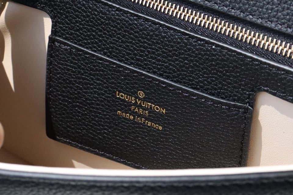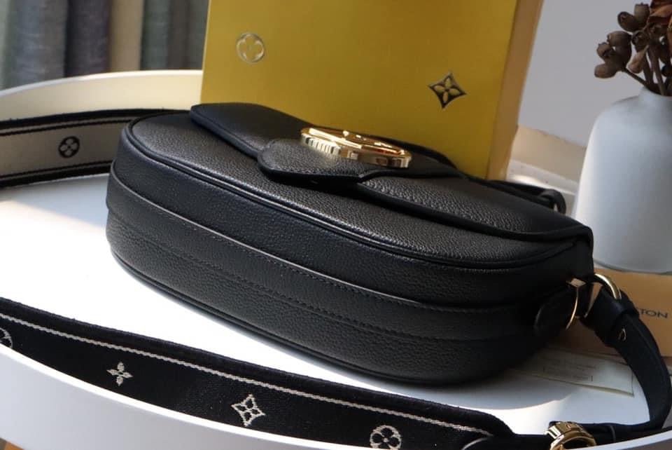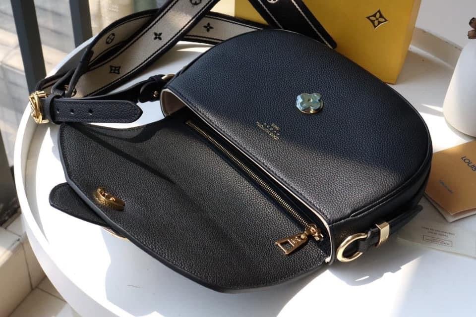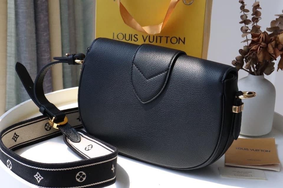 The LV Pont 9 Soft MM is a rounded handbag made from grained calfskin with smooth cowhide lining in a contrasting color and a wide two-color strap decorated with Monogram Flowers. The two sides of the strap are woven separately and then stitched together by hand. The new LV Circle signs this bag.