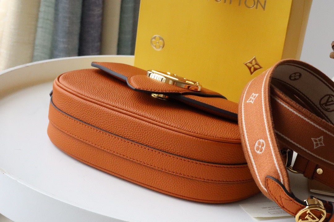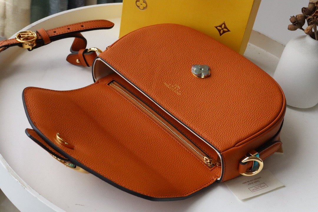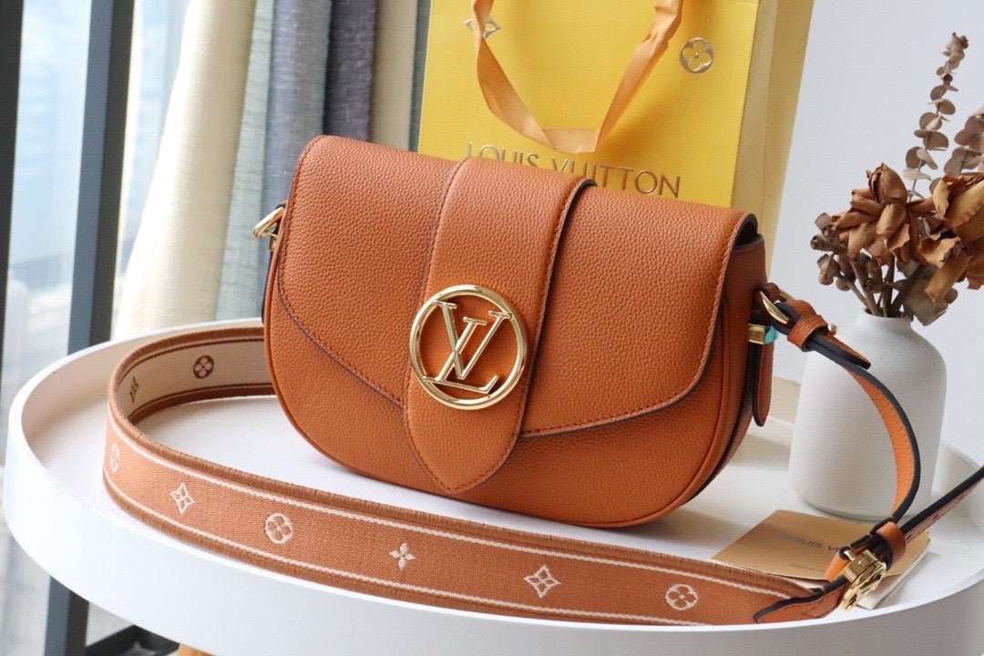 The LV Pont 9 Soft MM is a rounded handbag made from grained calfskin with smooth cowhide lining in a contrasting color and a wide two-color strap decorated with Monogram Flowers. The two sides of the strap are woven separately and then stitched together by hand. The new LV Circle signs this bag.