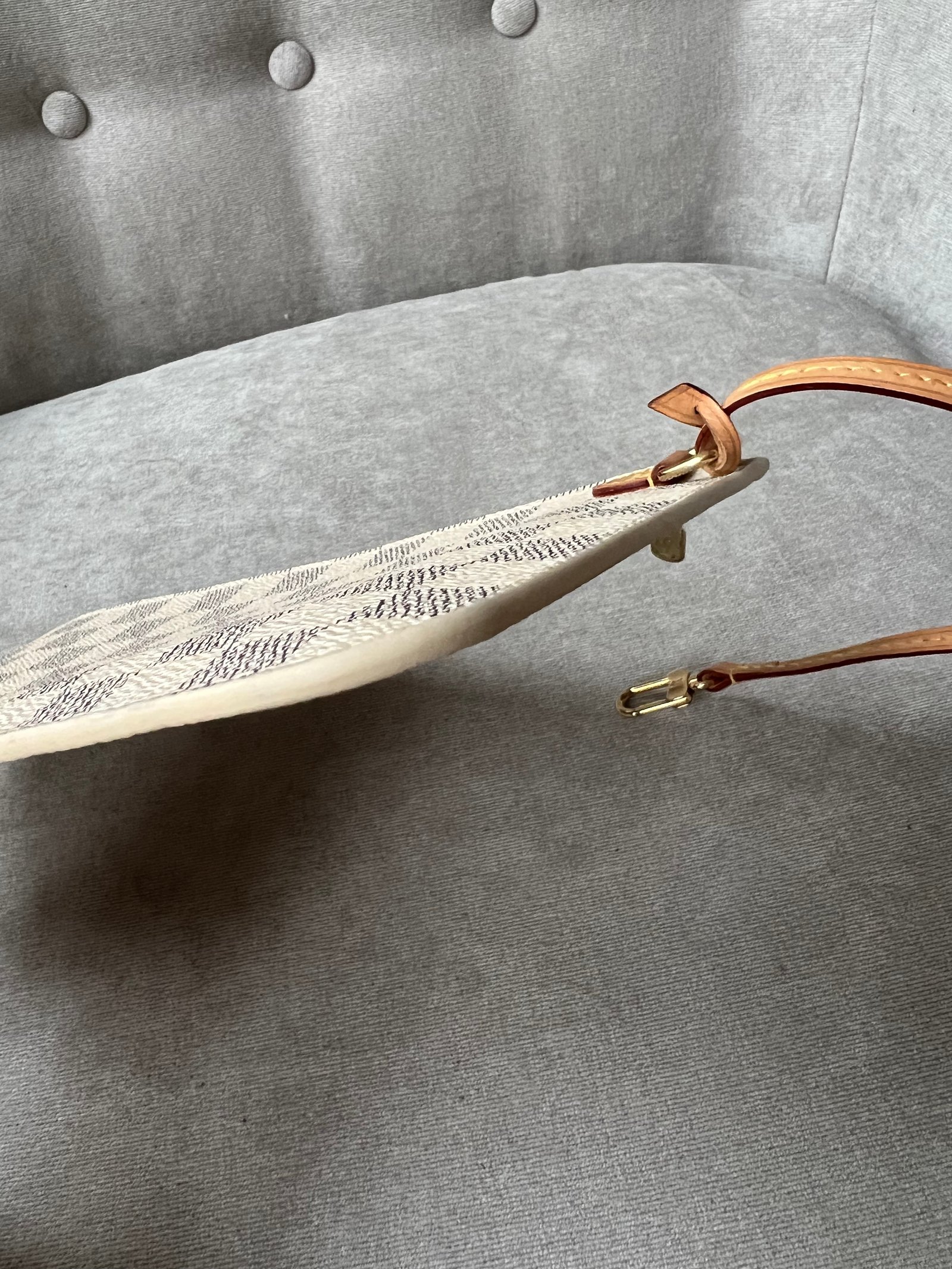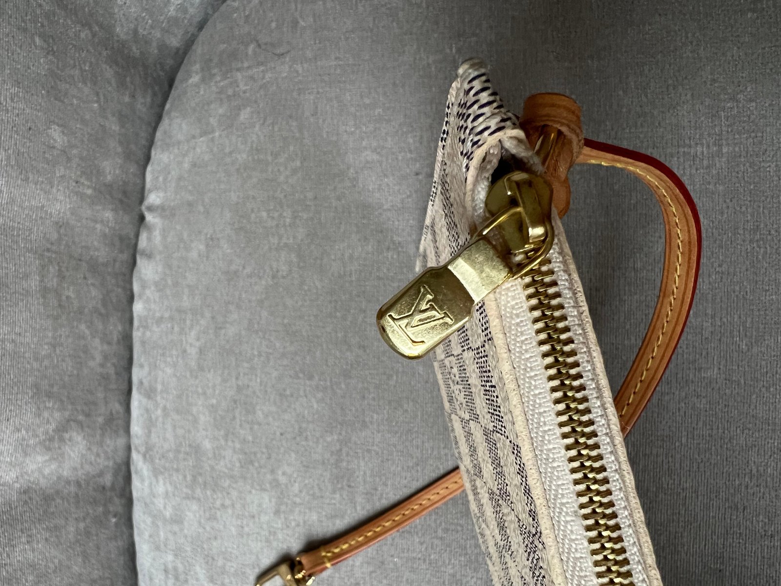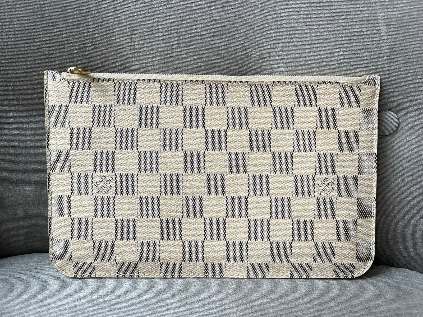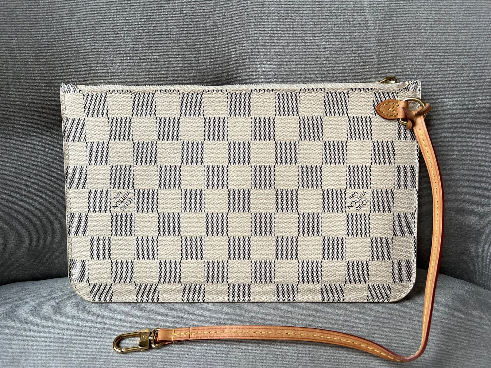 Louis Vuitton Pouch in Damier Azur with Beige interior. This handy pouch comes with the Neverfull MM. Zip top closure, can be used as a clutch, or attached to the inside of a bag using the short strap.