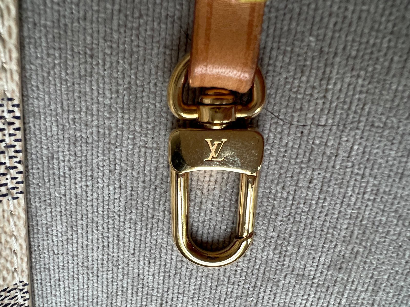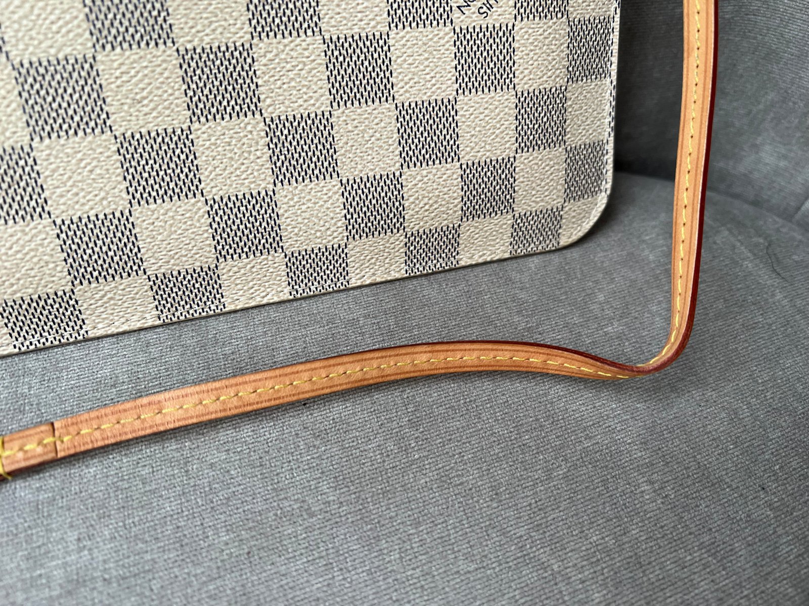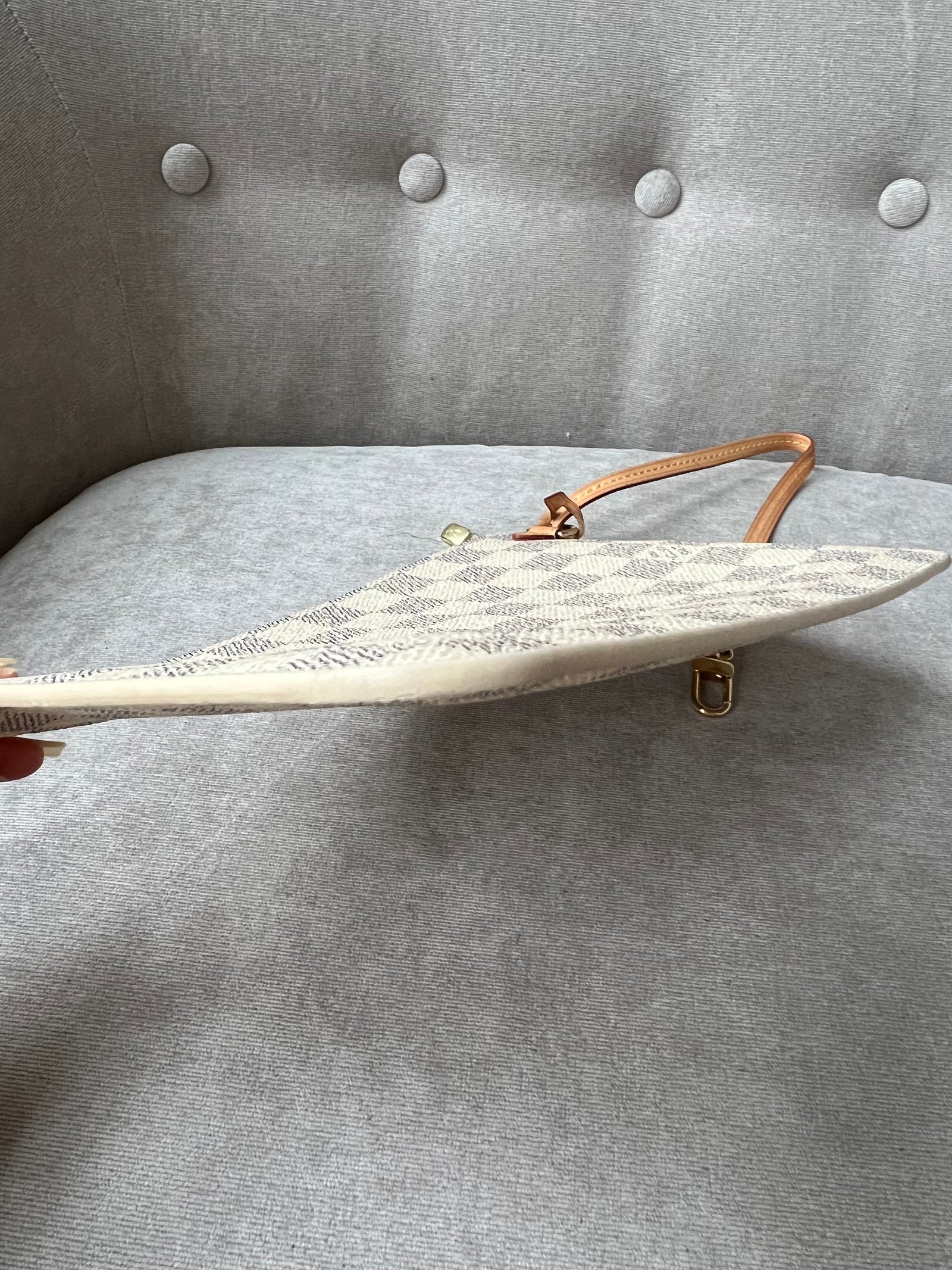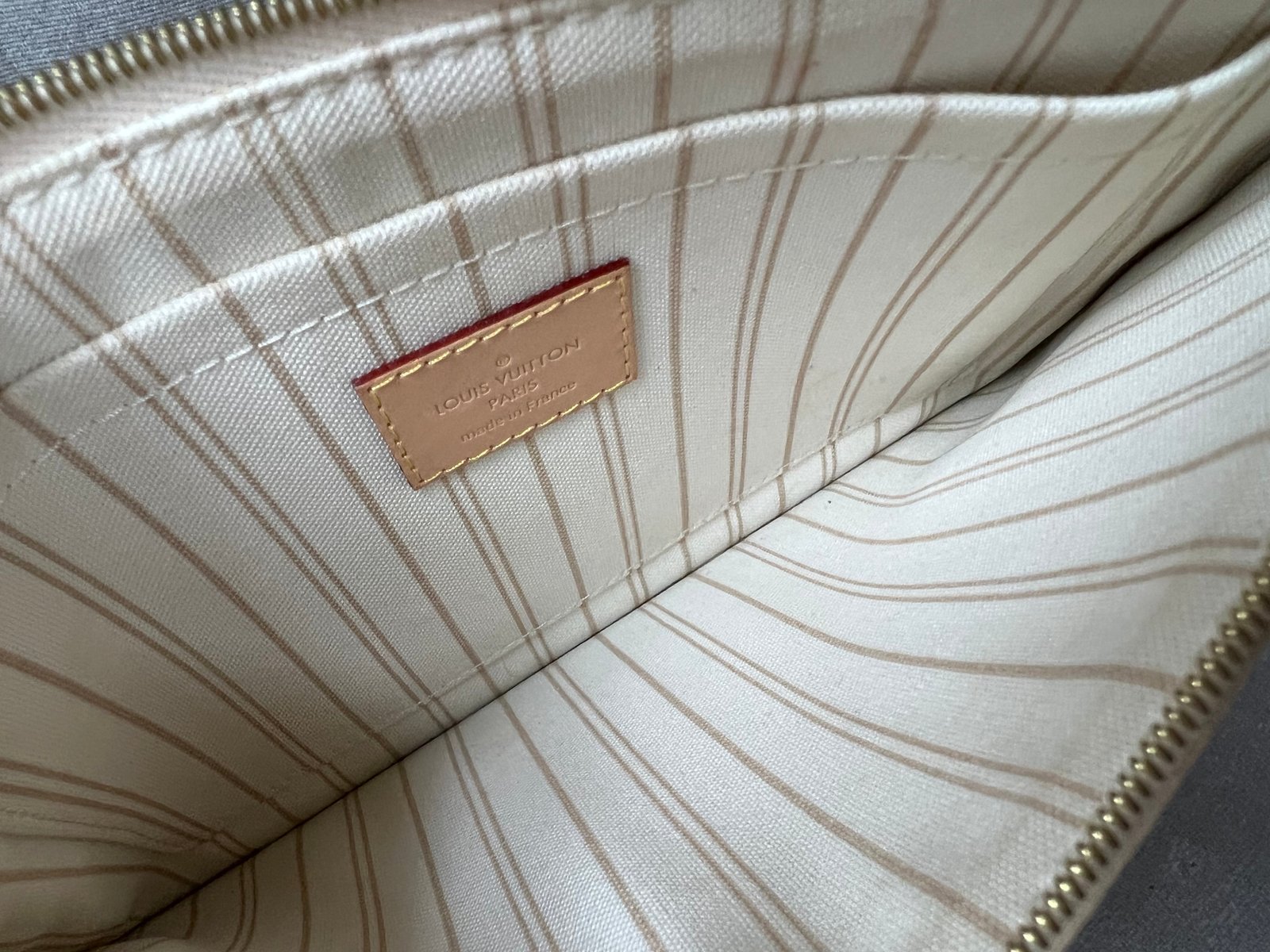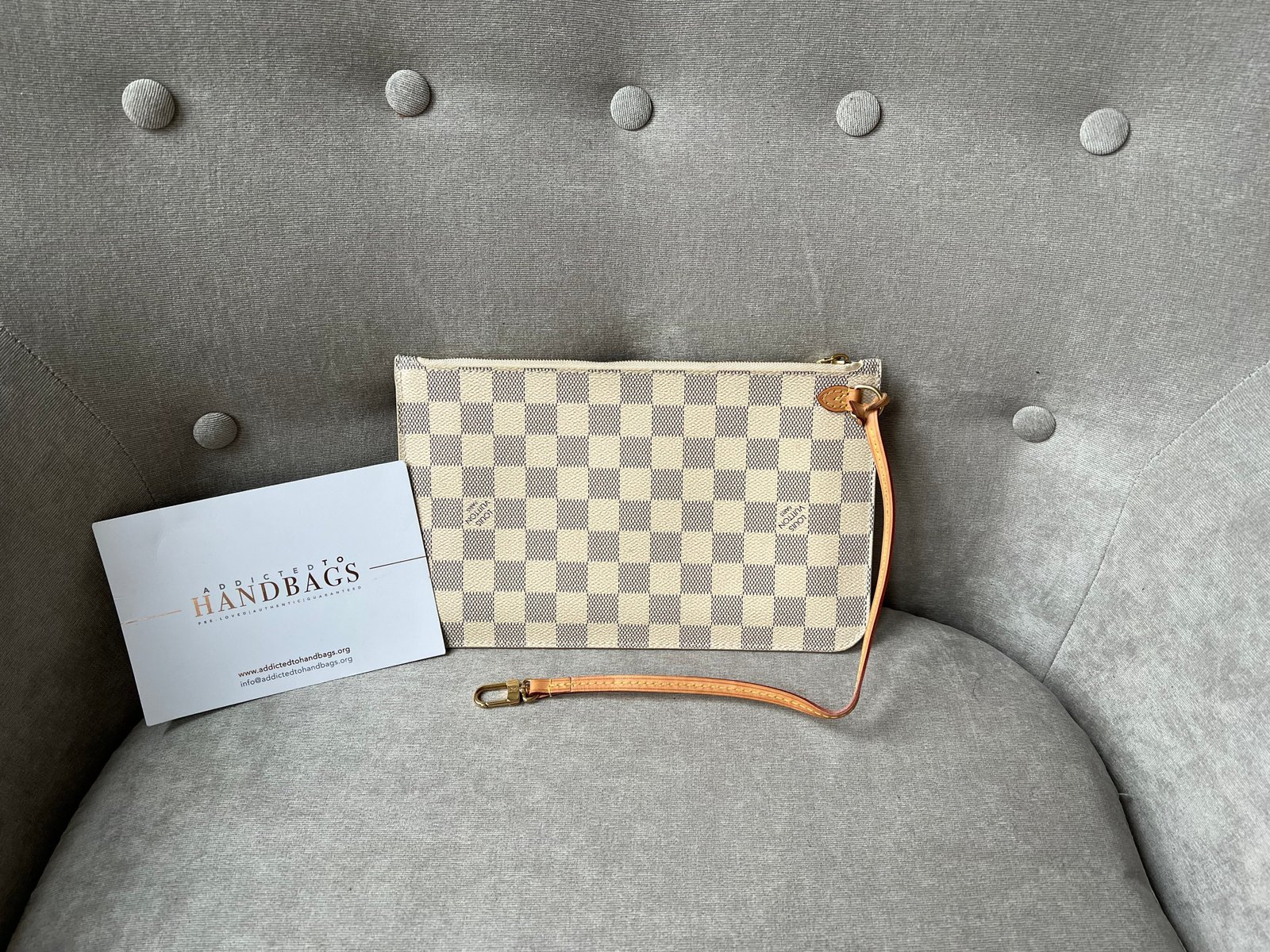 Louis Vuitton Pouch in Damier Azur with Beige interior. This handy pouch comes with the Neverfull MM. Zip top closure, can be used as a clutch, or attached to the inside of a bag using the short strap.
