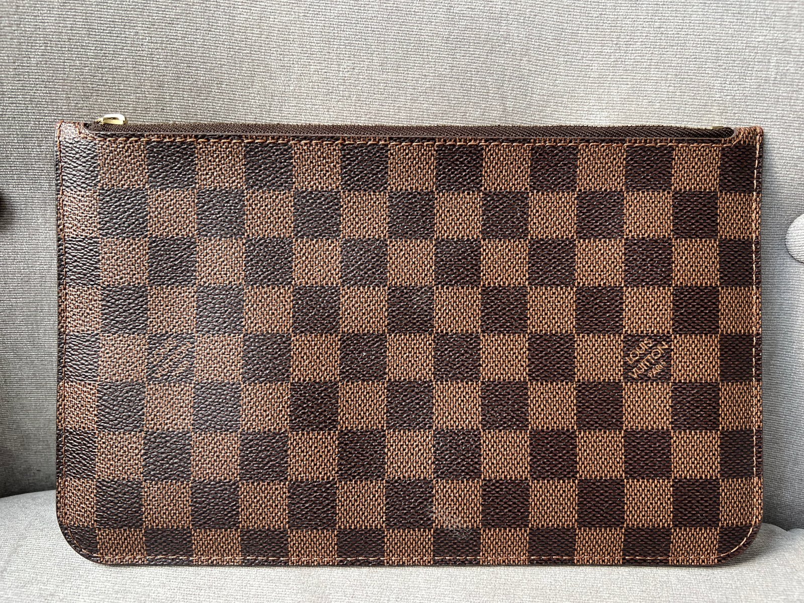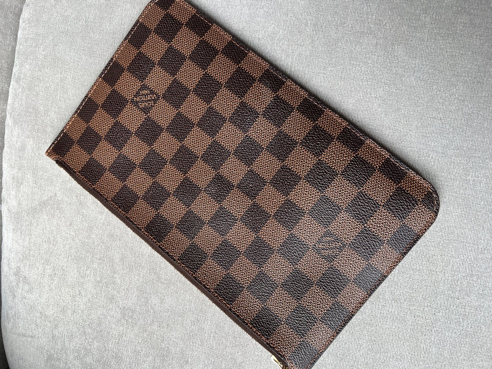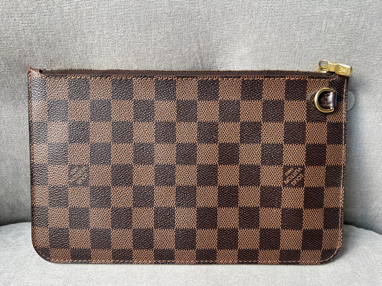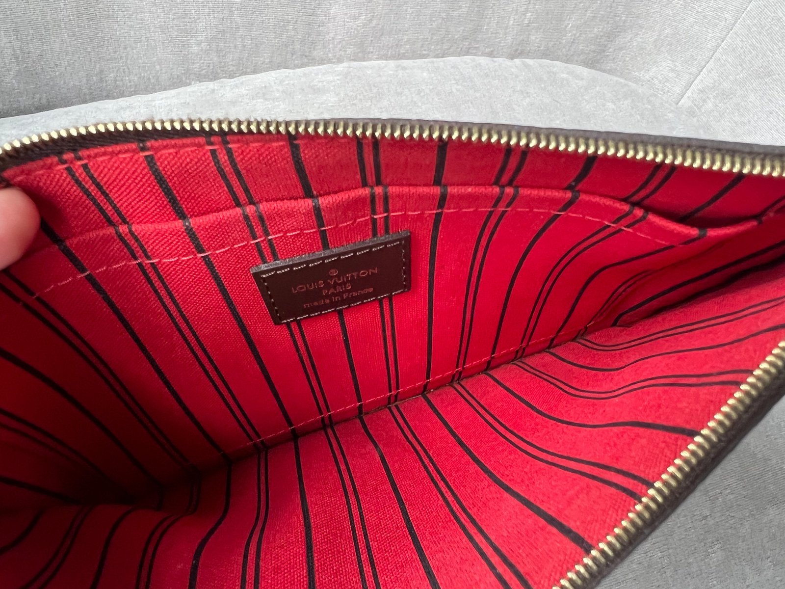 Louis Vuitton Pouch in Damier Ebene with Cherry Red interior. This handy pouch comes with the Neverfull MM. Zip top closure, can be used as a clutch, or attached to the inside of a bag.