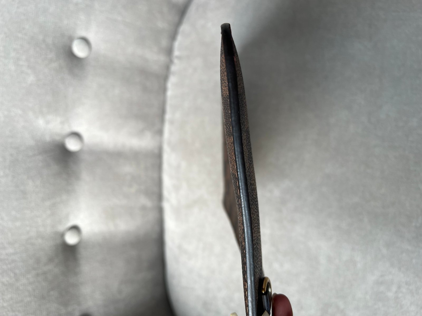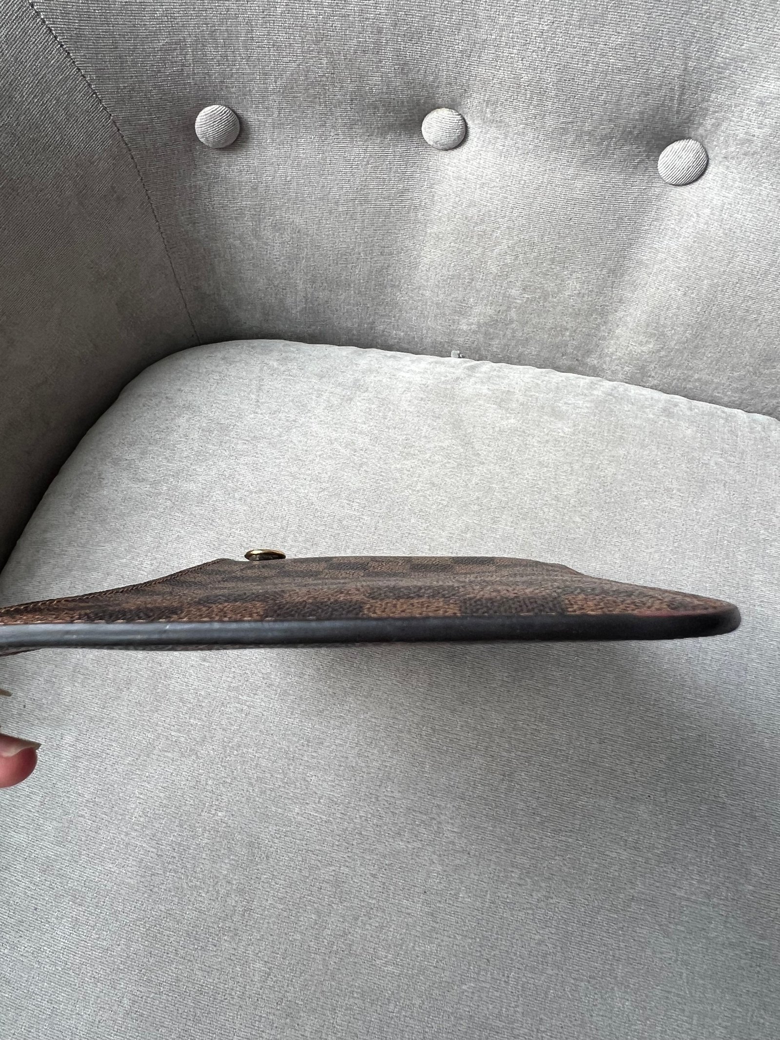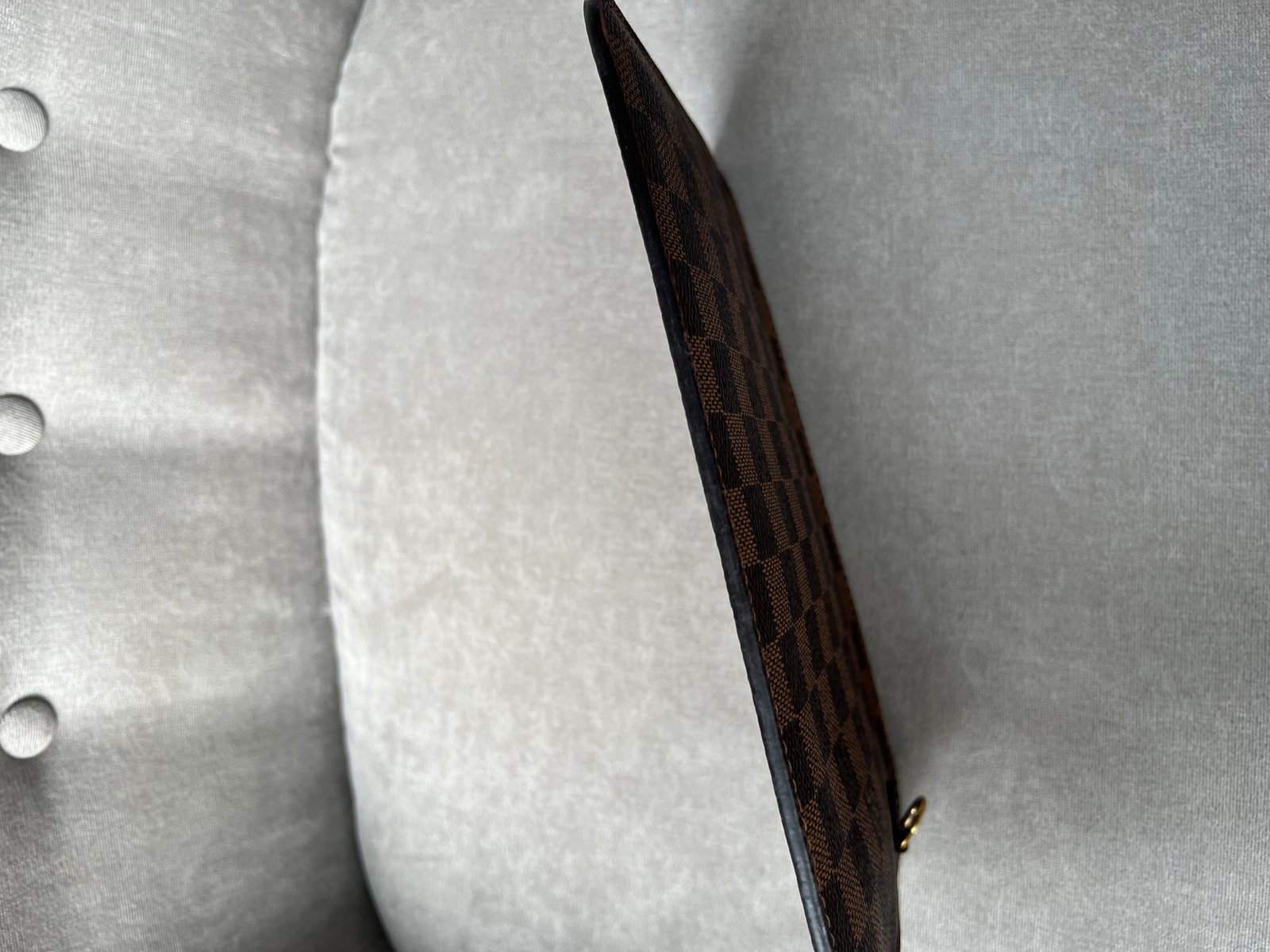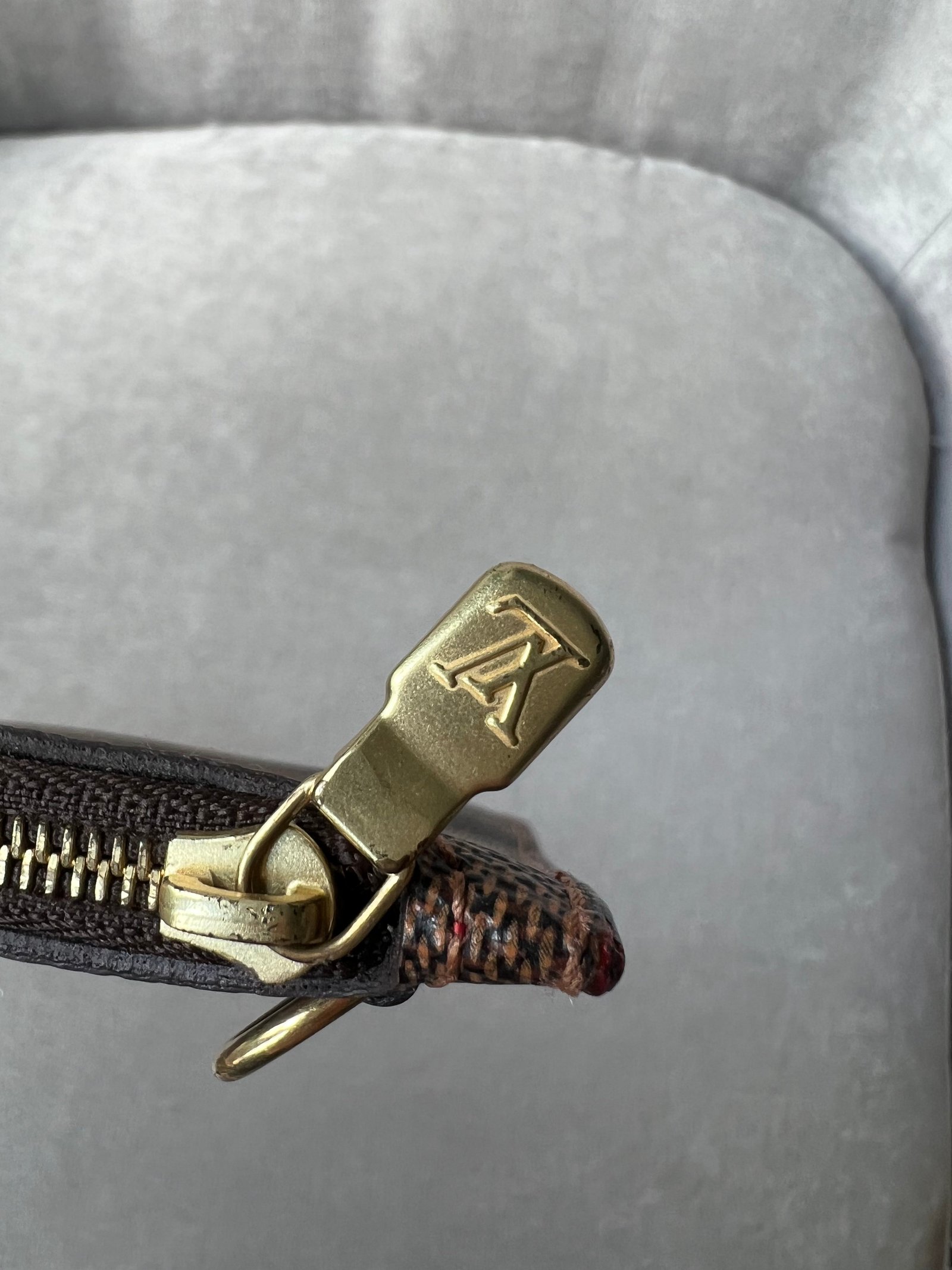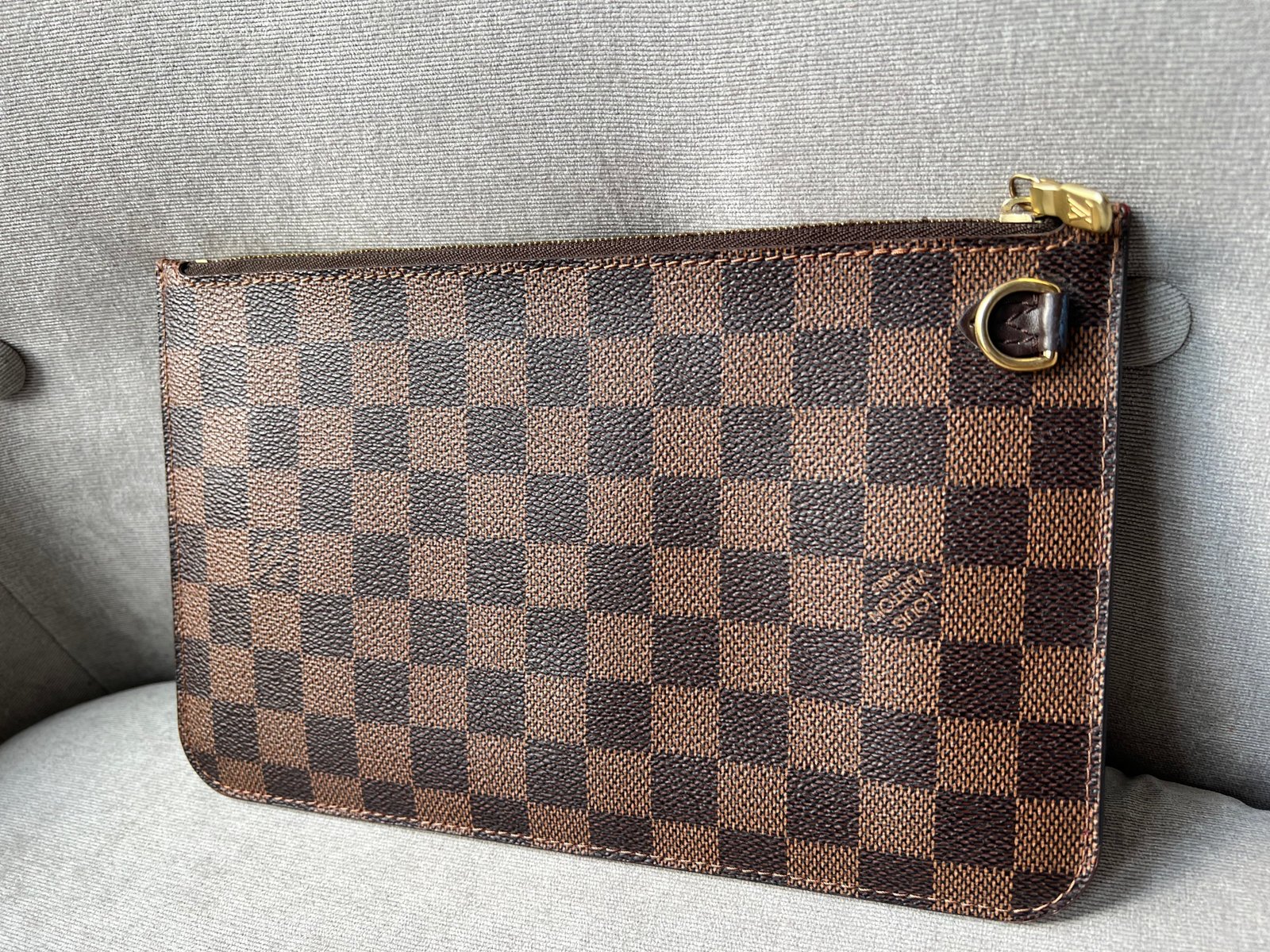 Louis Vuitton Pouch in Damier Ebene with Cherry Red interior. This handy pouch comes with the Neverfull MM. Zip top closure, can be used as a clutch, or attached to the inside of a bag.