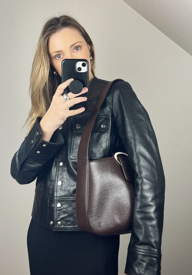 A beautiful Louis Vuitton brown Epi leather Reverie shoulder bag. A super chic discontinued style that features a resin loop that a short strap loops through to secure the opening with a magnetic button.