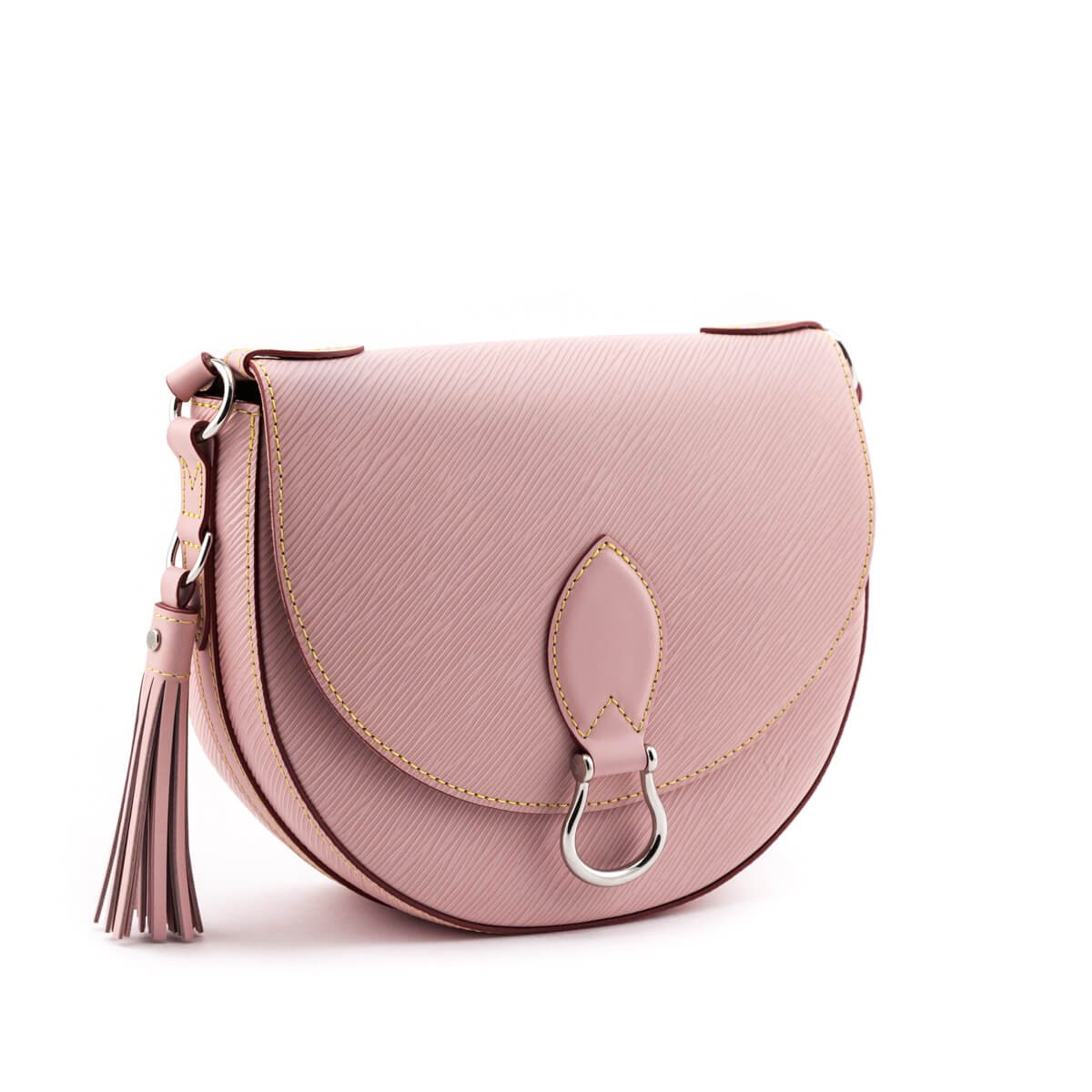 Fresh, flirty, and feminine, this Louis Vuitton Rose Ballerine Epi Saint Cloud NM will quickly become a constant in your handbag rotation. One of the first ever leather materials used by the fashion house, the infamous Epi leather captivates in the baby pink hue with the classic and instantly recognizable ripple-like texture. Tonal smooth leather accents are included throughout, and used to make up the flat, single strap with an adjustable buckle feature. Discreet in its placement, a flat slip pocket can be found at the back of this designer bag as a quick storage solution. The polished silver-tone hardware offsets the playful tassel charm and saddle silhouette with its sleek, modest finish – perfectly displayed by the decorative ring that freely hangs off the bag’s front flap. A magnetic snap holds the flap in place while closed, but opens to a neat light pink microfibre lined interior with a sole slip pocket available. Not your typical everyday pick, this durable design will add a pop of color to any outfit, any day of the week.