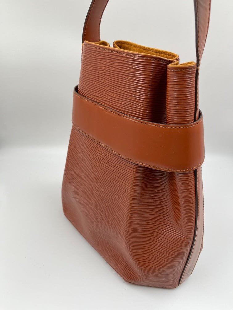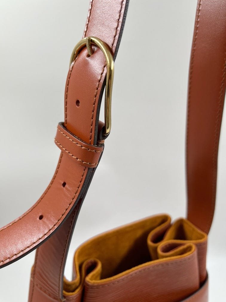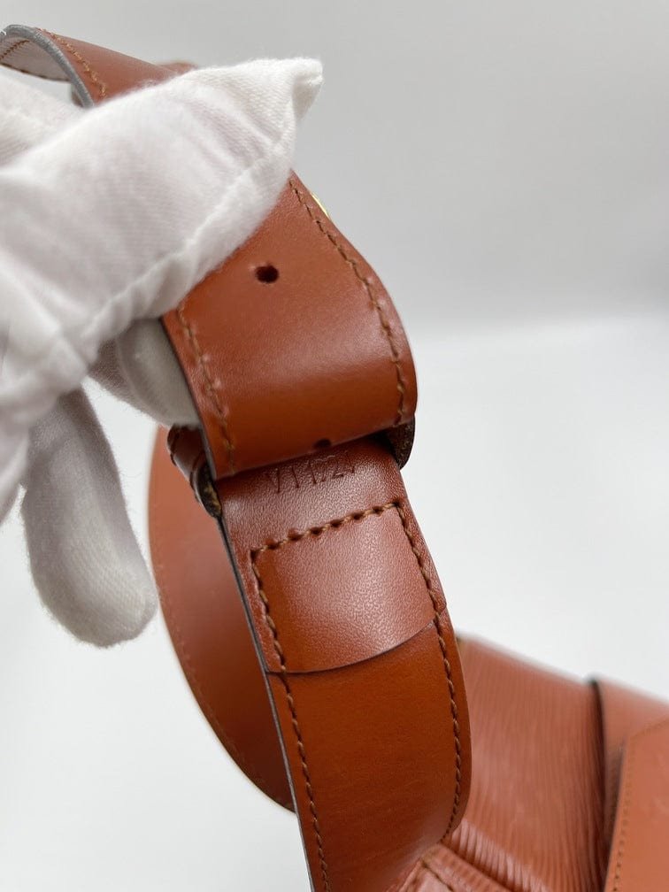 A stunning Louis Vuitton tan Sac D’epaule Epi leather shoulder bag. The bag is accessed by a leather strap embossed with the LV logo that is wrapped around the top of the bag and secured with a press stud. It can be carried on the shoulder with the wide adjustable shoulder strap. Inside is lined with a tan suede lining.